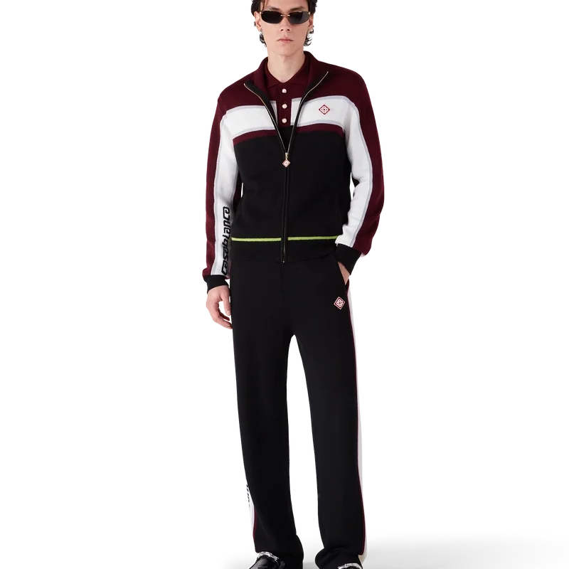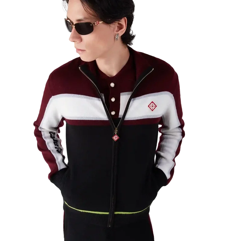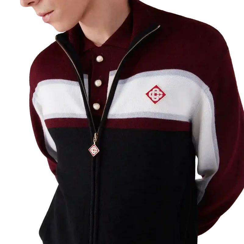 La giacca in merino a righe è un raffinato modello Apras-Sport con una struttura in maglia testurizzata. Rifinita con chiusura a zip integrale che presenta il logo a diamante caratteristico del marchio, dettagli a righe sul petto e sulle maniche, marchio Casablanca e vestibilità comoda che unisce la praticità atletica alla sensibilità sartoriale.