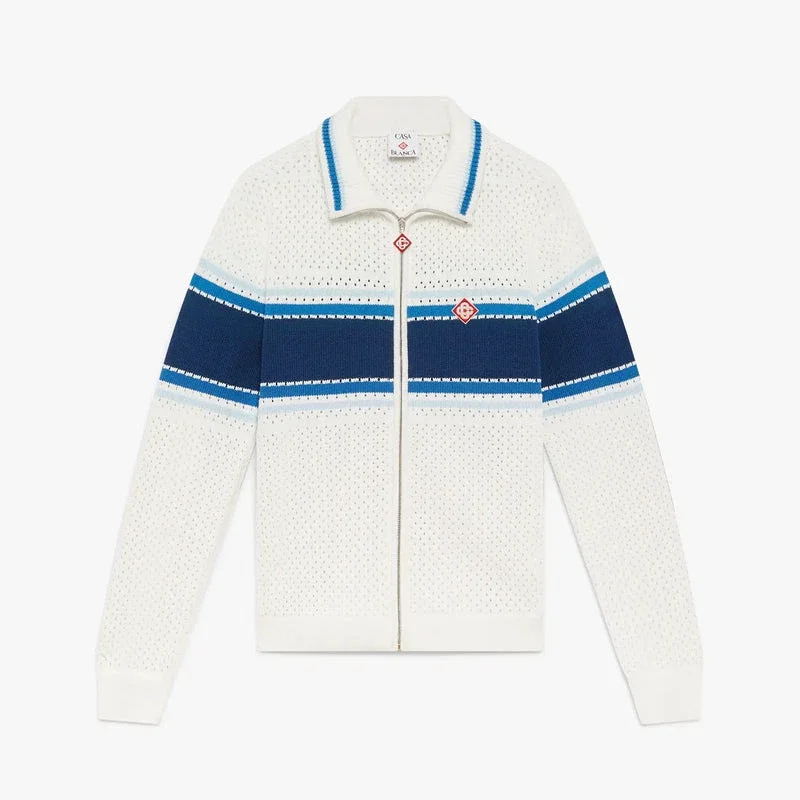 La giacca da training in rete a righe presenta un design raffinato, caratterizzato da una riga blu sul petto, sulle maniche e sulla schiena. Rifinita con chiusura a zip con linguetta con il logo a diamante della Maison, collo, polsini e orlo in maglia con bordi a righe blu e tasche laterali.