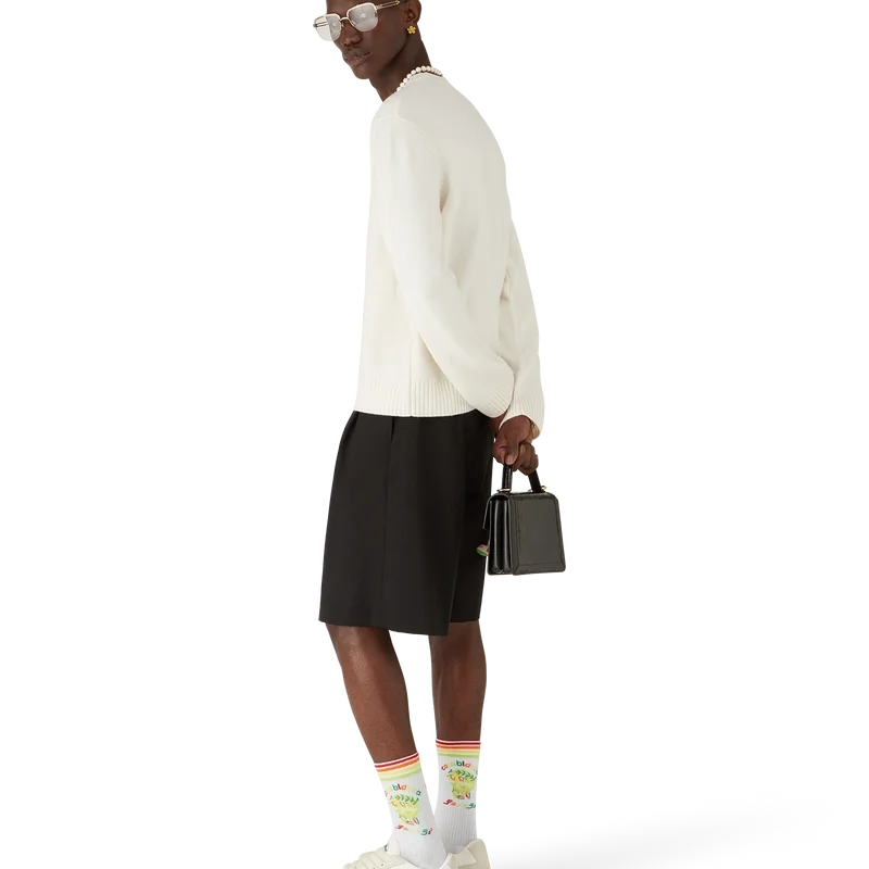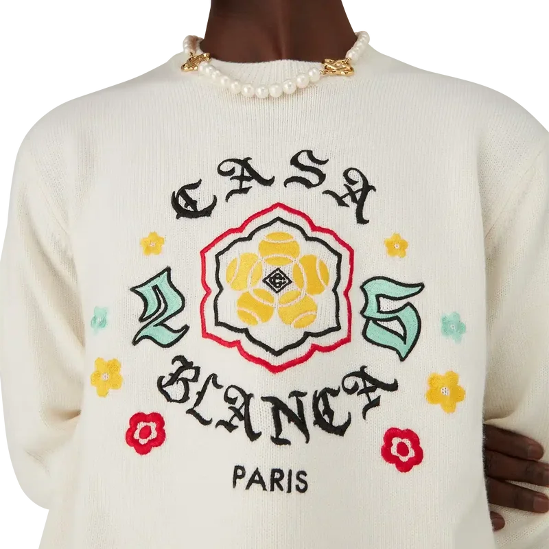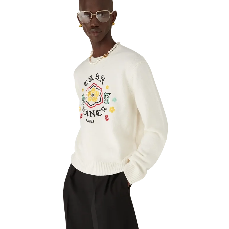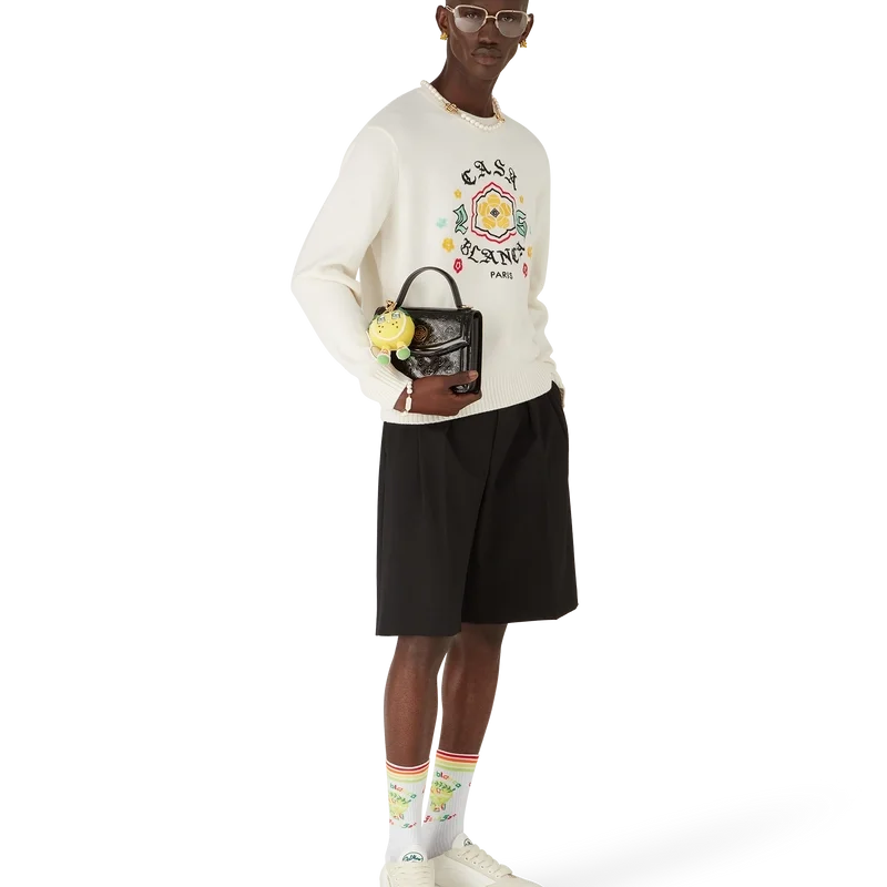 La maglia a collo rotondo in maglia merino Emblem è un maglione a maniche lunghe che presenta la grafica di questa stagione, per la quale abbiamo tratto ispirazione dalla sottocultura giapponese dei BōSōZoku come uno dei nostri temi principali. Il contrasto tra gli elementi grafici e il testo ci ha ricordato molto Casablanca. Abbiamo creato la nostra interpretazione personale della grafica BōSōZoku, incorporando frasi che descrivono il marchio, come “Looking at the Beauty of the World” (Guardando la bellezza del mondo). Il layout è non convenzionale, ma la composizione è accuratamente bilanciata, conferendo al capo un aspetto unico ma armonioso. Completato da classico collo a costine, polsini e orlo.