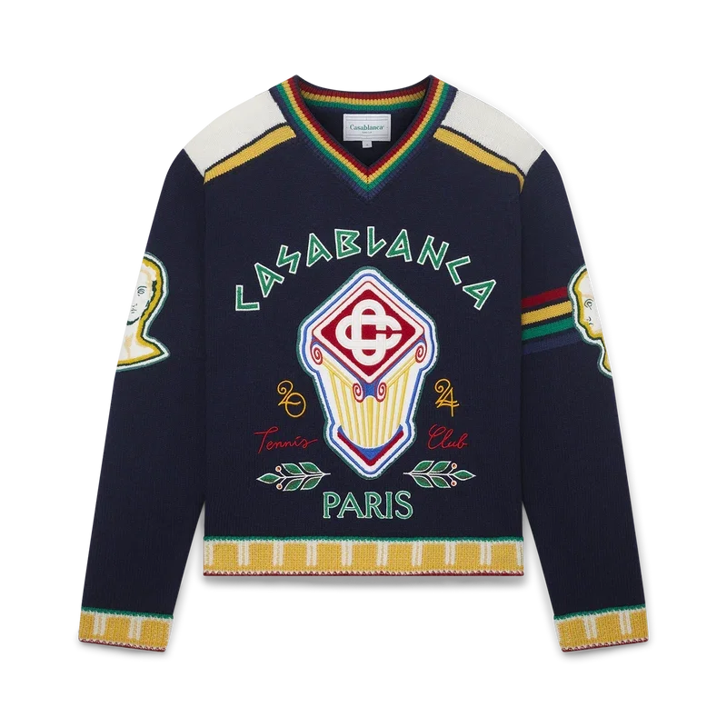 Il maglione Fraternity è un modello a maniche lunghe realizzato in tessuto di lana, impreziosito da patchwork con iconografia greca e dal logo Casablanca adattato al tema dell’antica Grecia. Completato da spalline a contrasto, scollo a V, collo, polsini e orlo a costine multicolori.
