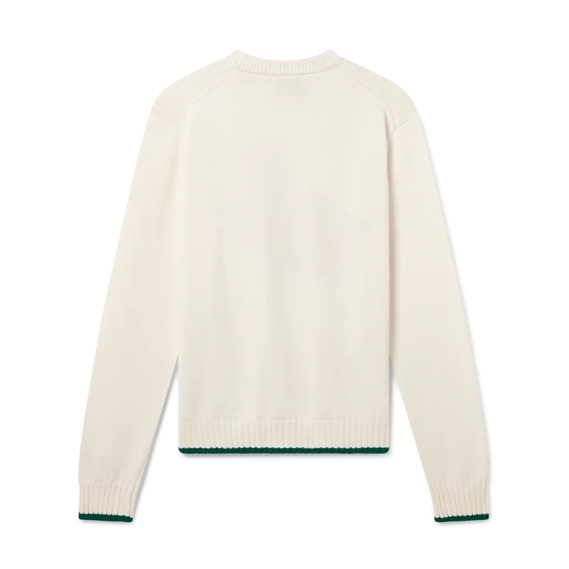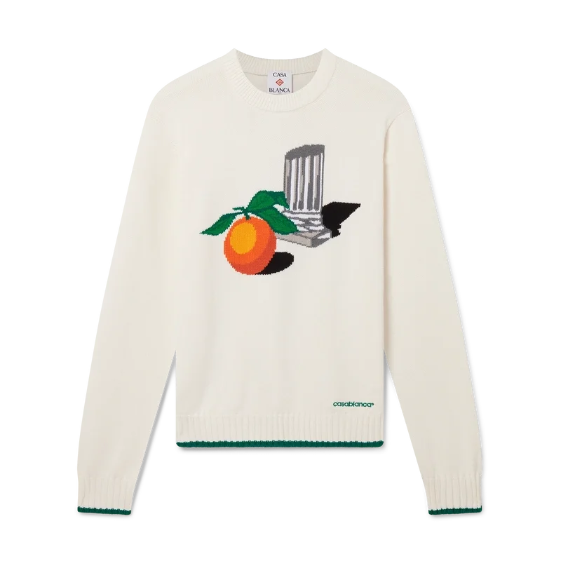 Il maglione intarsiato è un modello in maglia a maniche lunghe bianco che presenta il motivo stagionale della Maison ispirato all’antica Grecia e l’elemento di design della Maison – l’arancione – realizzato in tessuto di cotone traspirante. Il modello è completato da un classico girocollo, collo a costine e polsini e orlo con dettagli a contrasto.