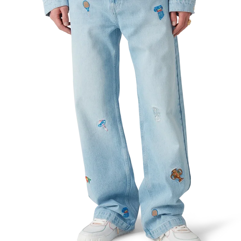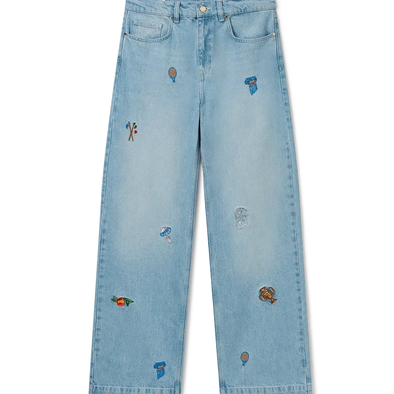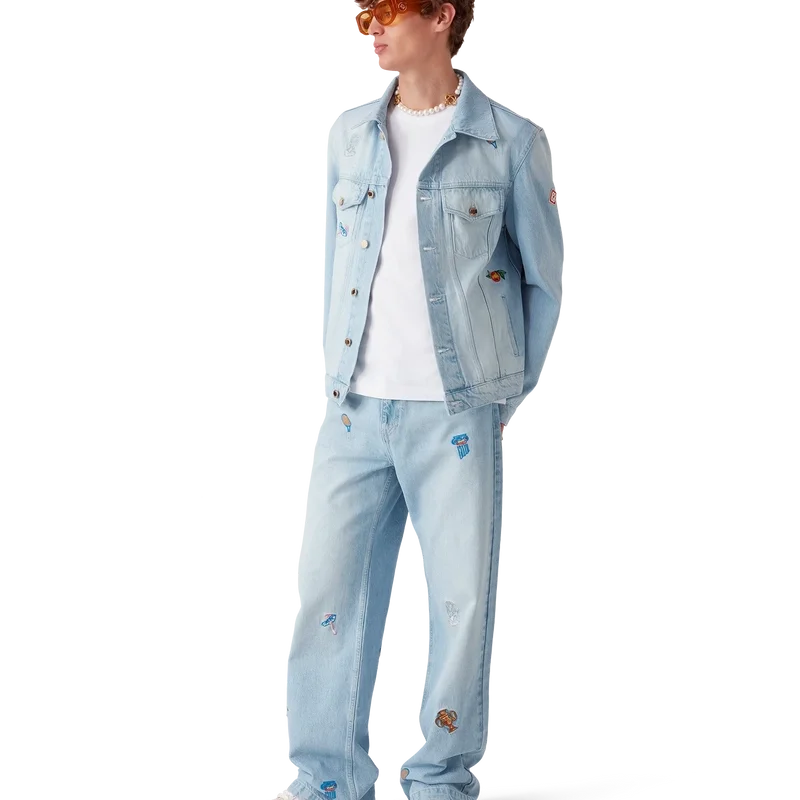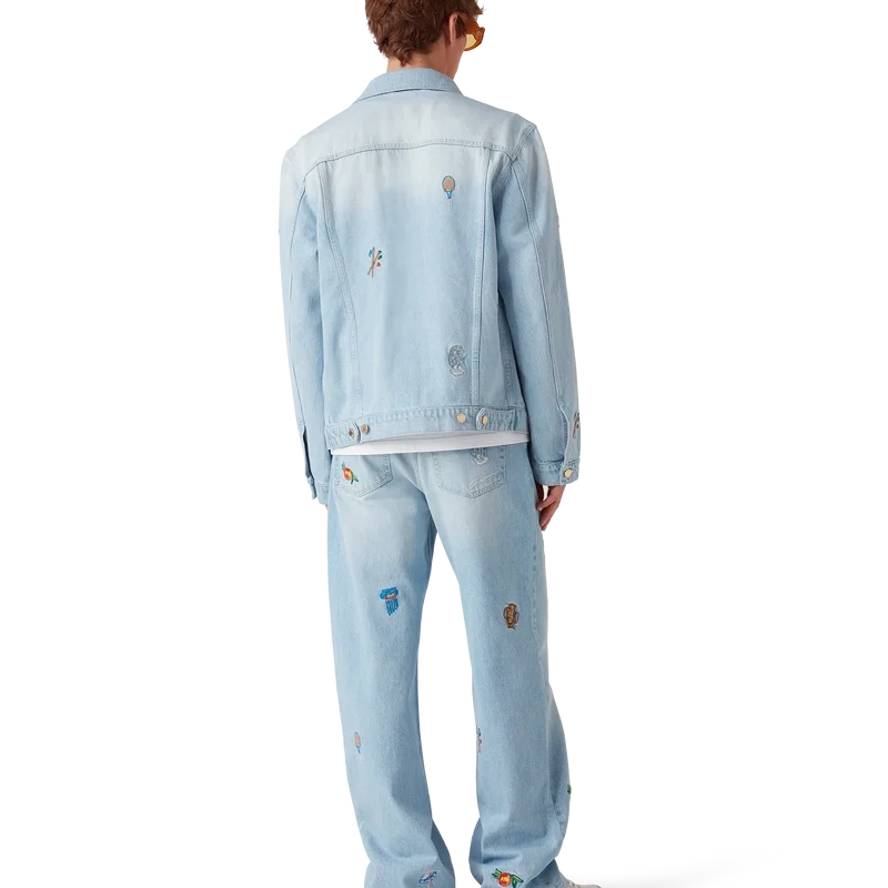 I jeans con motivo ricamato sono in denim stone-washed, realizzati in tessuto di cotone ricamato e progettati per una vestibilità classica. Rifiniti con un ricamo che rappresenta la simbologia della Maison con la natura e l’architettura, tasche posteriori, dettagli metallici dorati con marchio e chiusura con cerniera. Da indossare con la giacca coordinata.