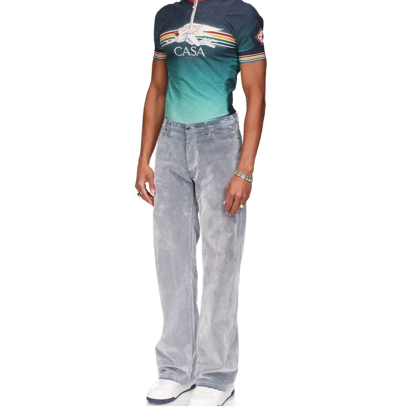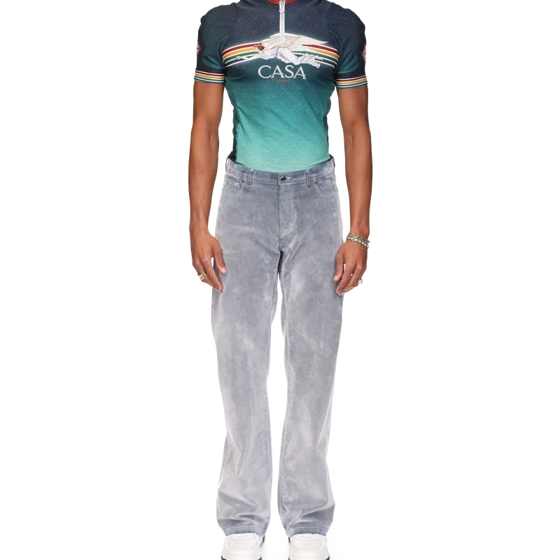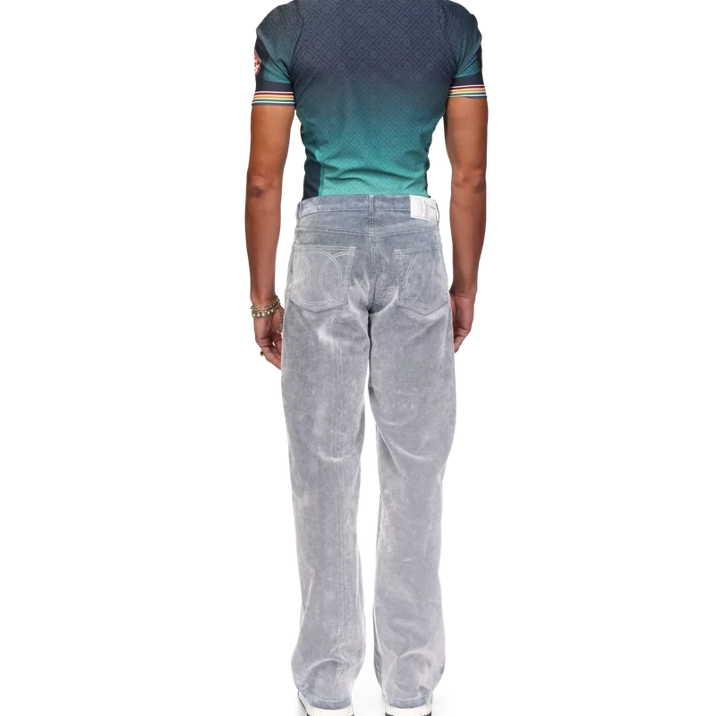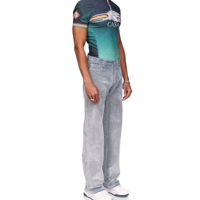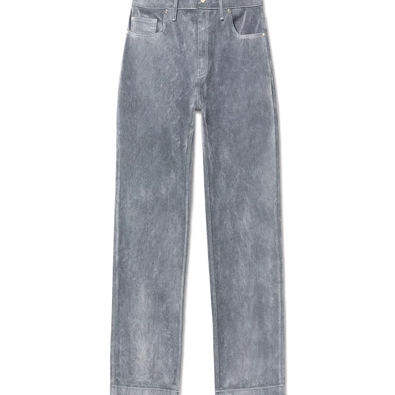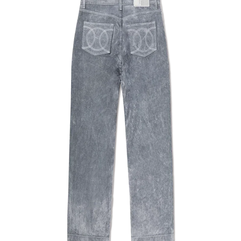 I jeans con texture pesca hanno un design a gamba dritta e sono realizzati in tessuto misto cotone. Rifiniti con dettagli metallici placcati in oro con marchio, chiusura con cerniera, tasche anteriori e posteriori, toppa in pelle con marchio e passanti per cintura.