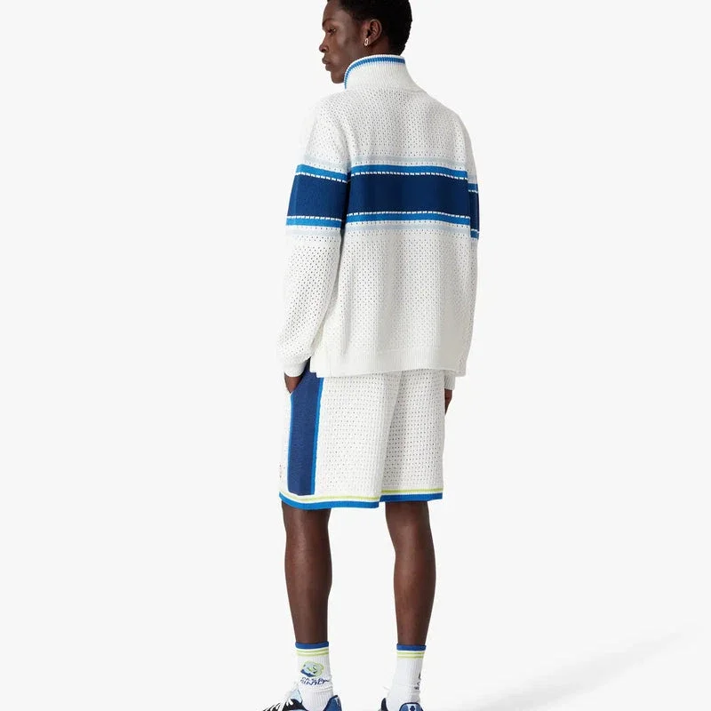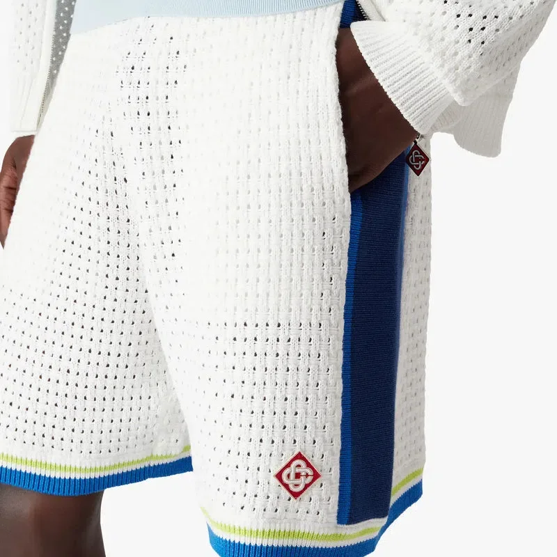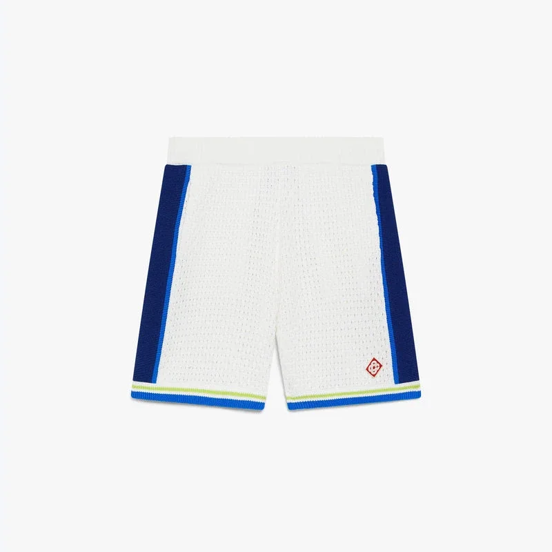 I pantaloncini all’uncinetto bianchi e blu presentano un design raffinato, realizzati con una trama aperta e caratterizzati da dettagli a righe lungo i lati. Completati da un elastico in vita, chiusura con coulisse, tasche laterali interne e bordi a righe sulle gambe.