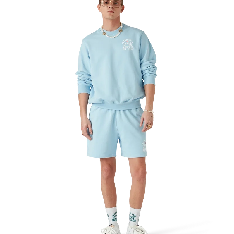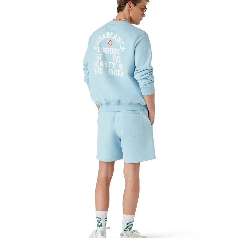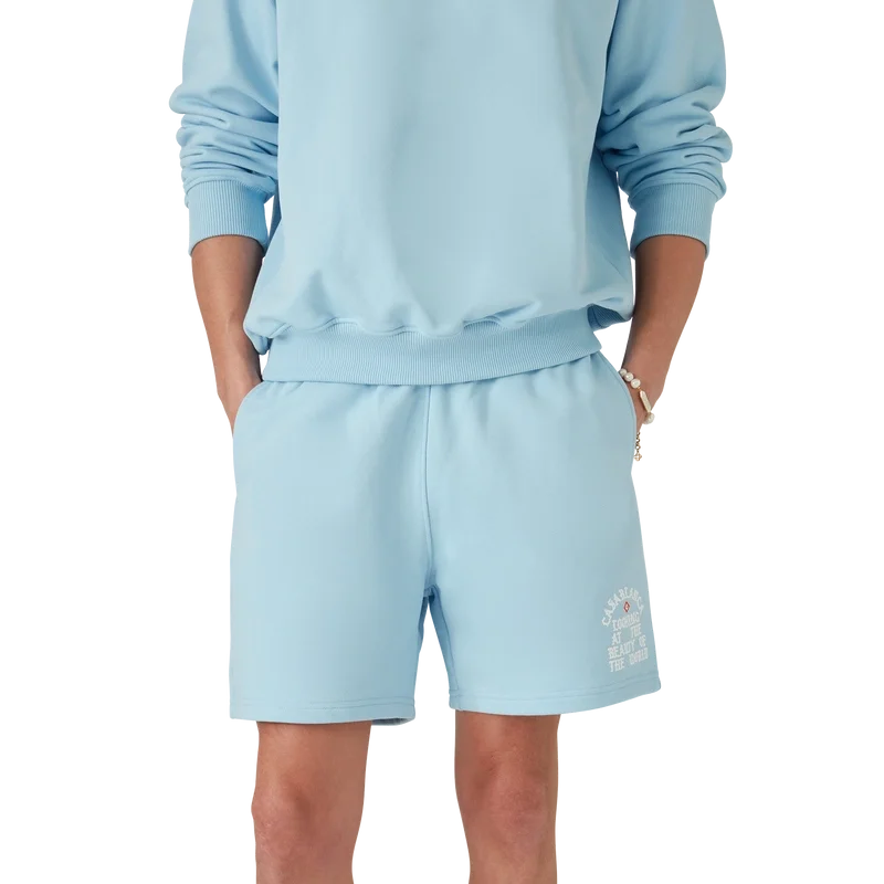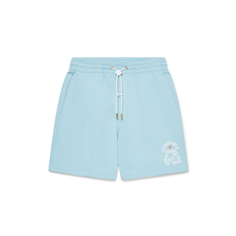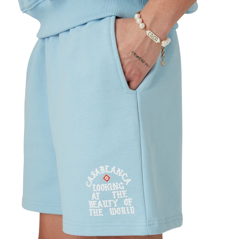I pantaloncini Beauty of the World sono un capo di abbigliamento sportivo realizzato in tessuto di cotone biologico e presentano il motto del marchio Casablanca in caratteri gotici ispirati alla cultura di strada. Sono dotati di elastico in vita, cordino con puntali dorati, tasche laterali oblique e tasca posteriore applicata.