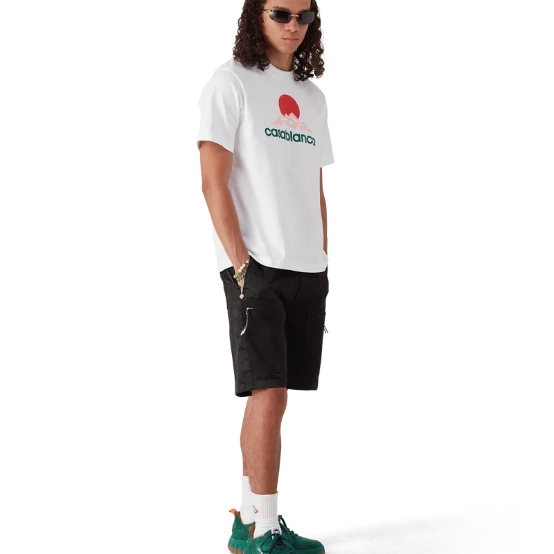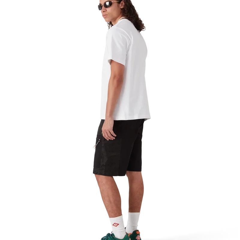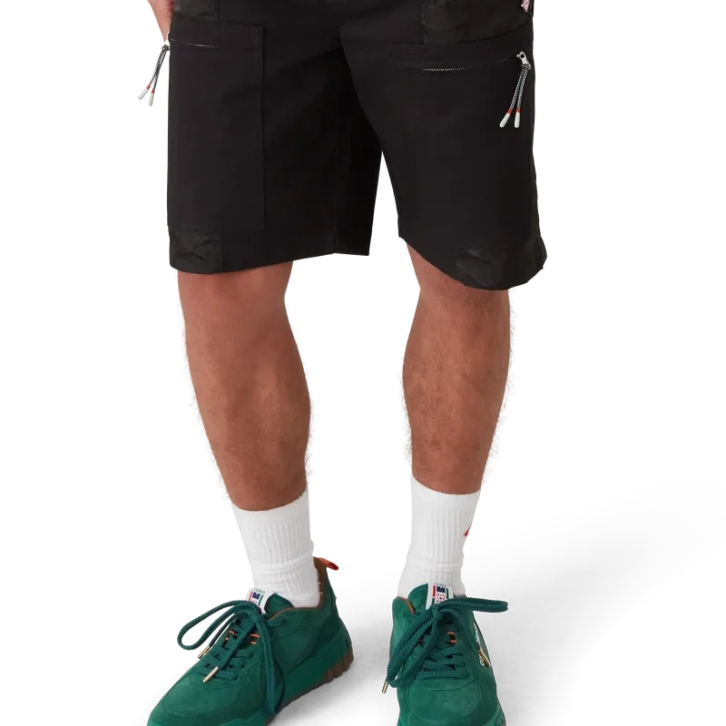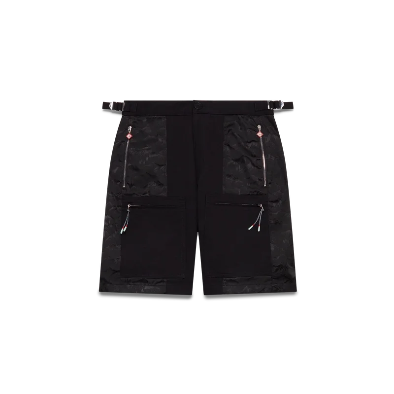I pantaloncini cargo in nylon Mountain Camo sono un modello al ginocchio realizzato in tessuto jacquard di nylon e cotone.