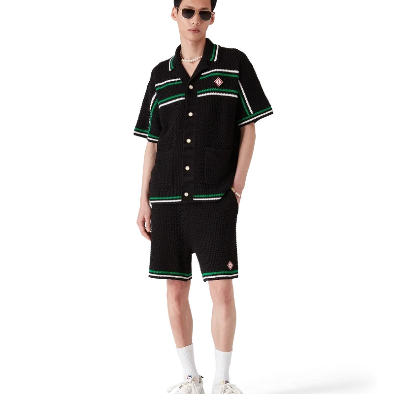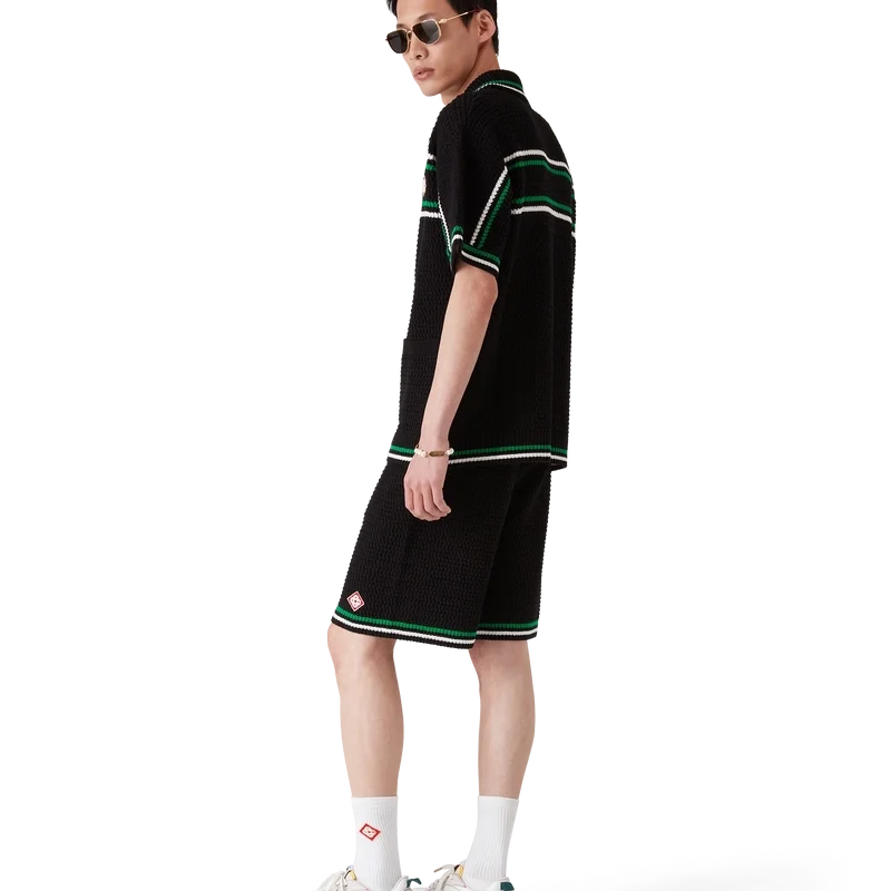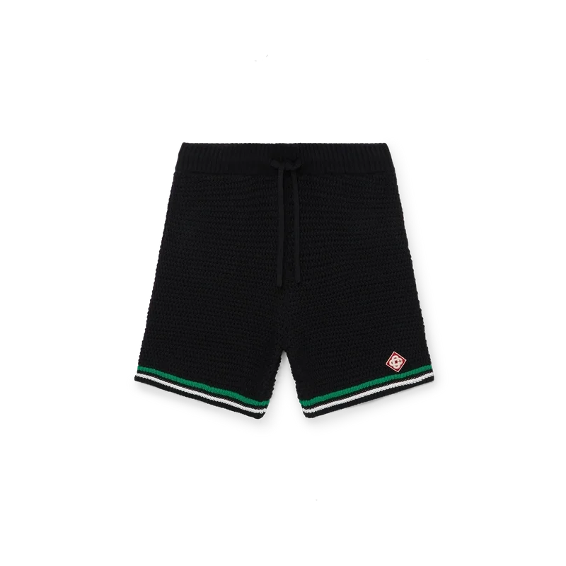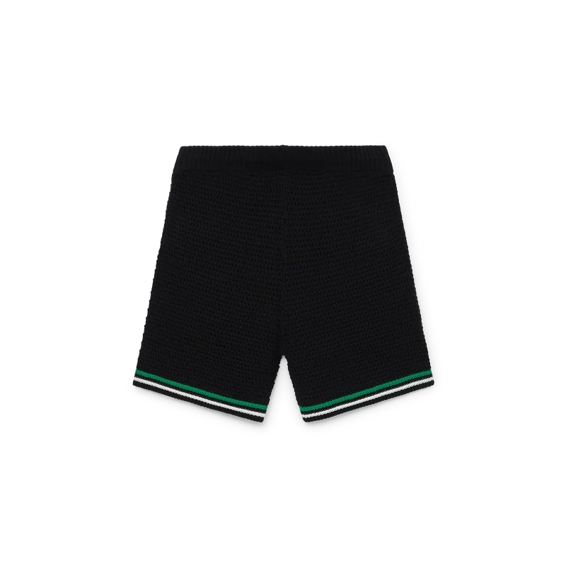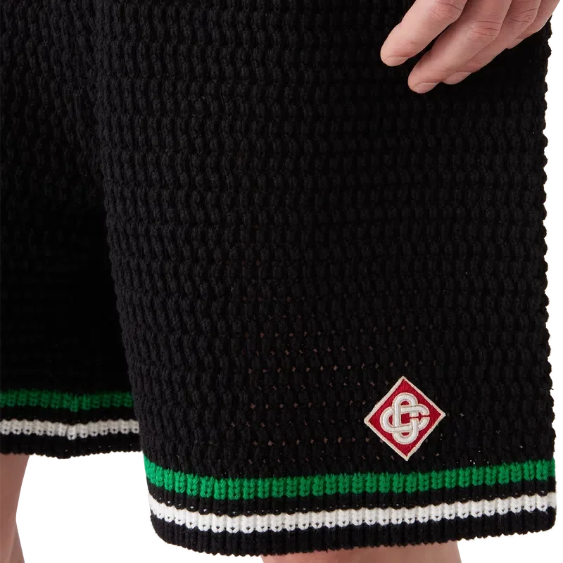I pantaloncini da tennis all’uncinetto presentano un design dalla texture morbida, realizzati in tessuto di cotone lavorato a maglia, con il caratteristico logo a rombi della Maison. Rifiniti con elastico in vita a costine bianche a contrasto, chiusura con coulisse e bordi rifiniti, e dettaglio a righe verdi e bianche sull’orlo.