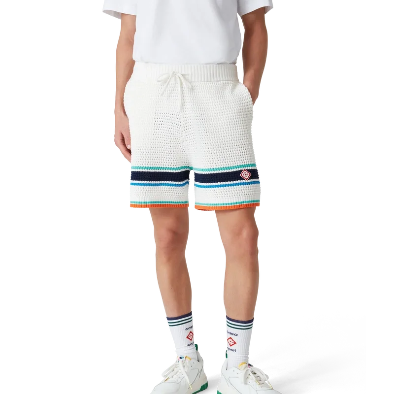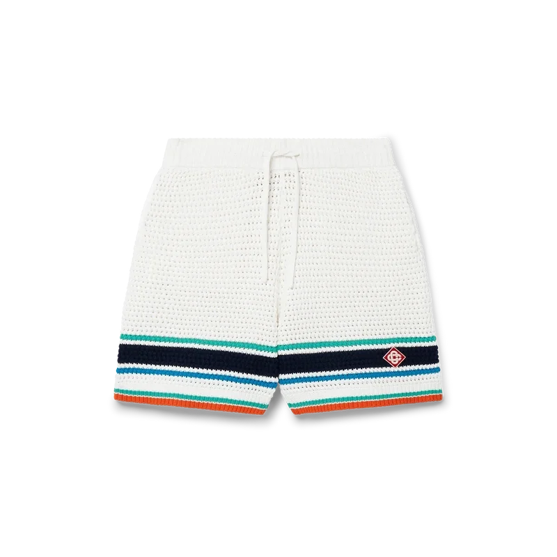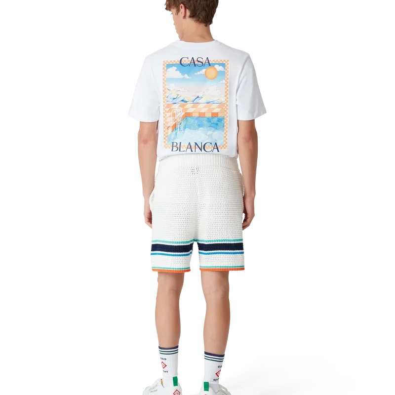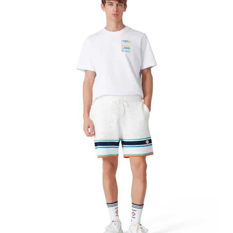 I pantaloncini Tennis Crochet presentano un design dalla texture morbida, realizzati in tessuto di cotone biologico a maglia, con il caratteristico logo a rombi della Maison che richiama il tema del viaggio e delle vacanze della capsule collection. Rifiniti con una cintura elastica a costine con chiusura a coulisse, tasche laterali e dettaglio a righe a contrasto sull’orlo.