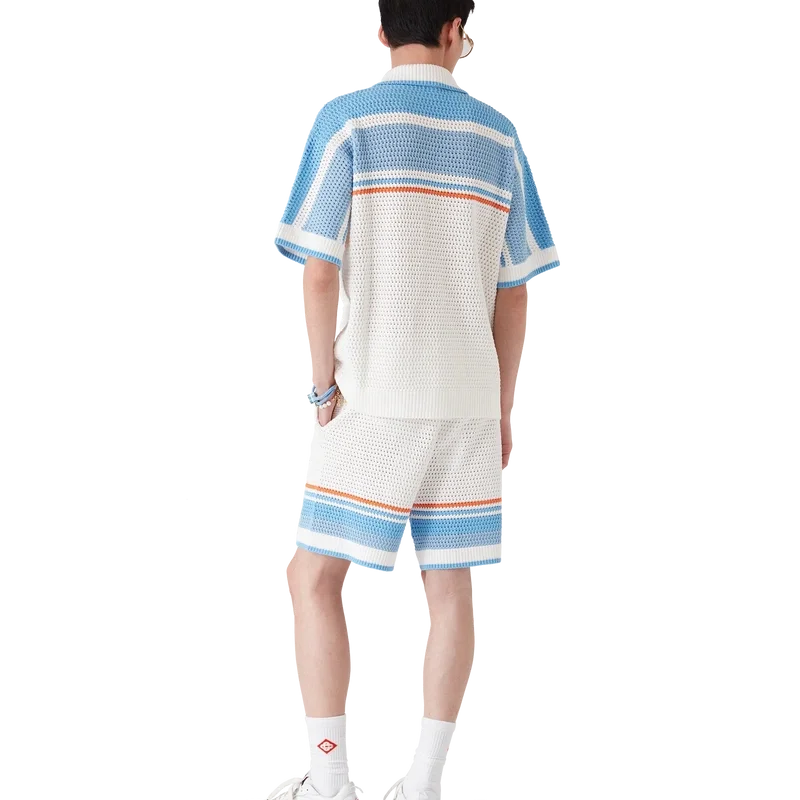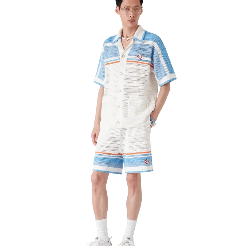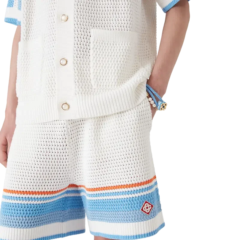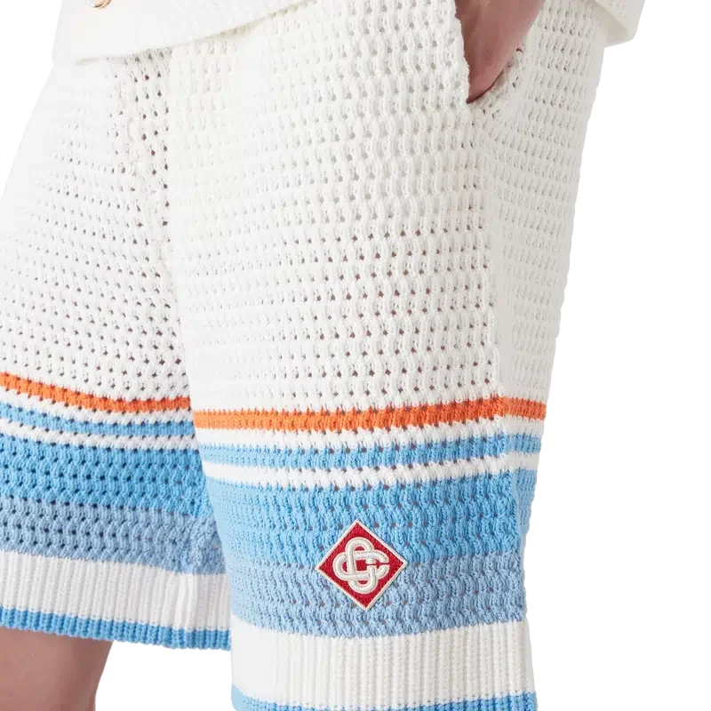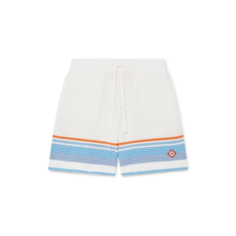 I pantaloncini da tennis all’uncinetto presentano un design classico, realizzati in tessuto di cotone all’uncinetto in morbidi colori naturali e caratterizzati dal logo a diamante iconico della Maison. Completati da cintura elasticizzata, tasche interne e orlo a righe.