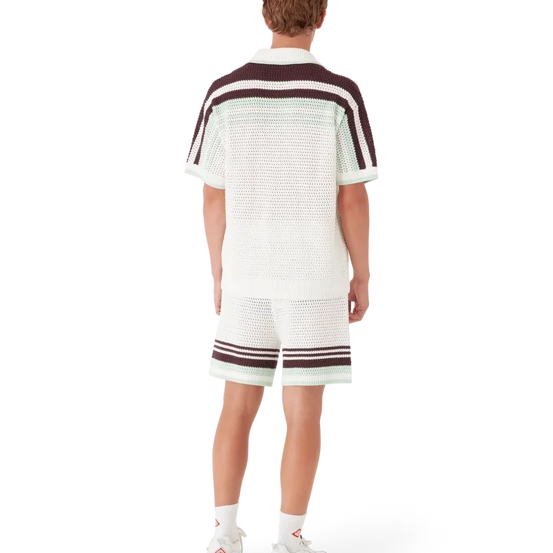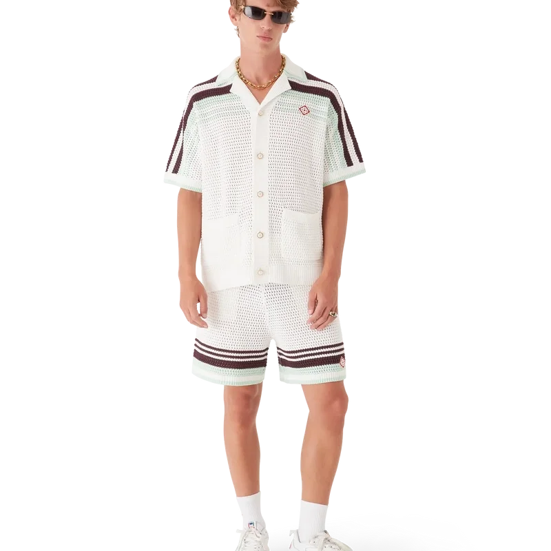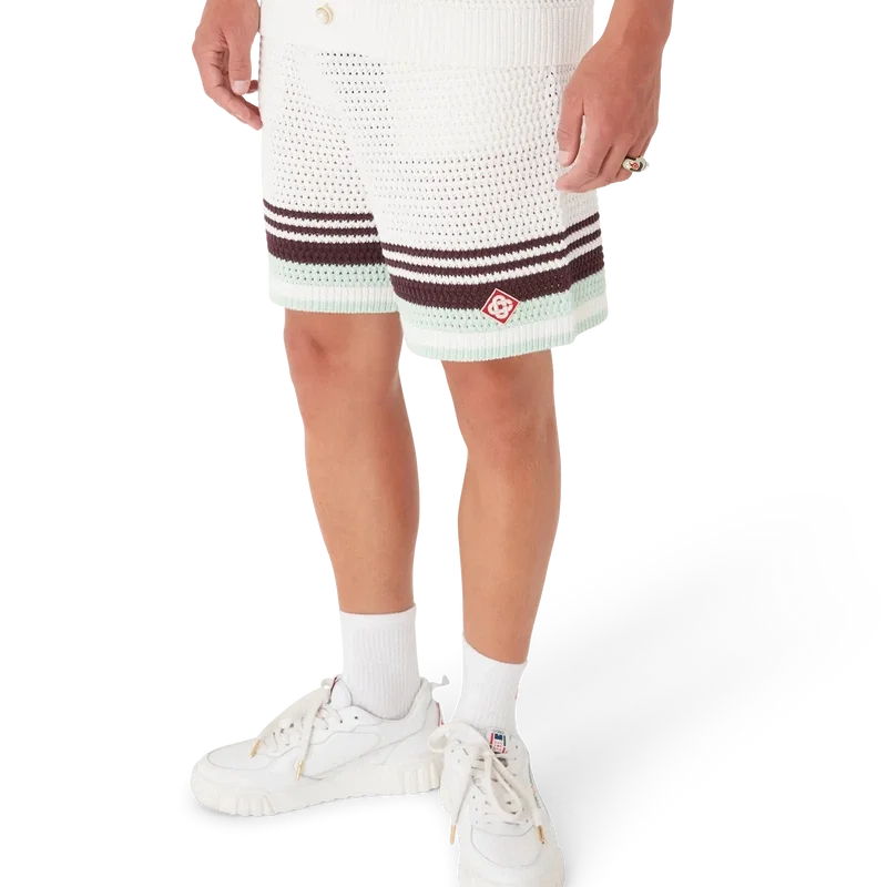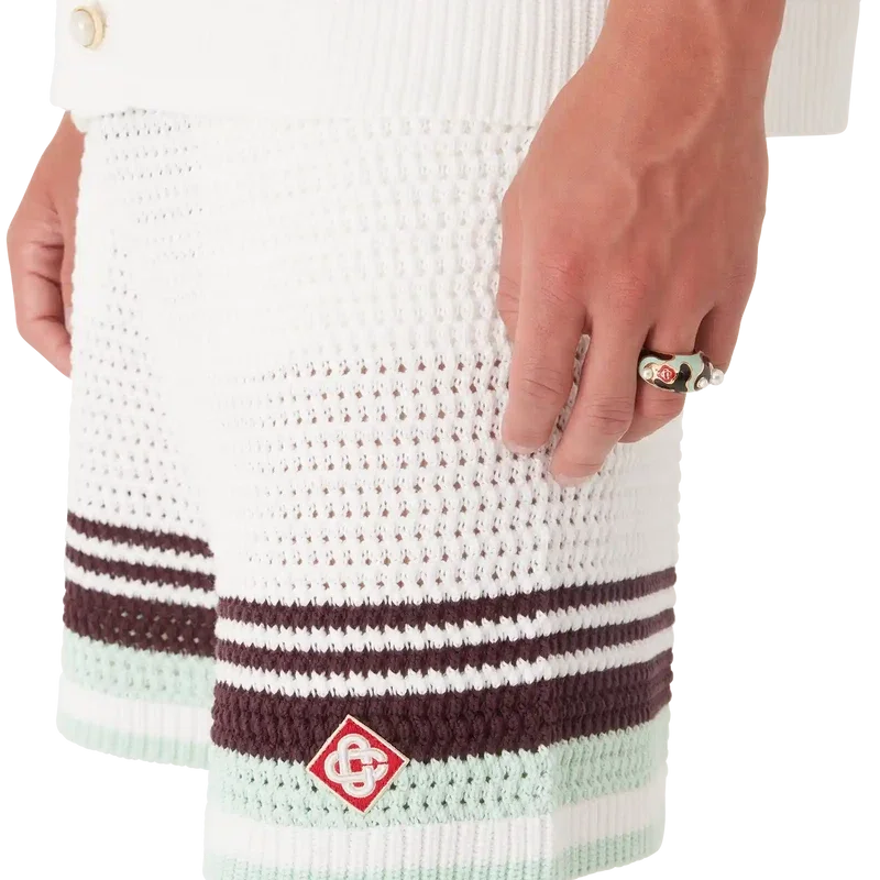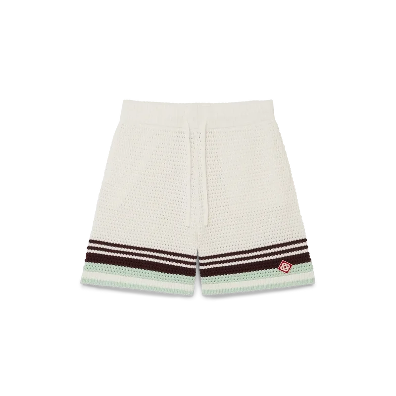 I pantaloncini da tennis all’uncinetto presentano un design classico, realizzati in tessuto di cotone all’uncinetto in morbidi colori naturali e caratterizzati dal logo a diamante iconico della Maison. Completati da cintura elasticizzata, tasche interne e orlo a righe.