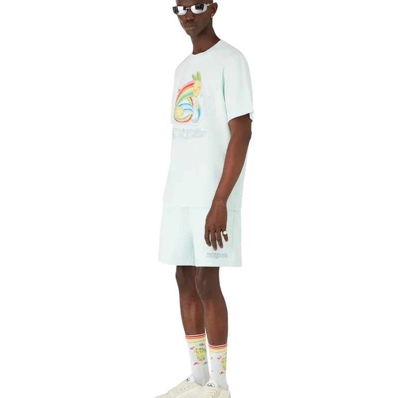 I pantaloncini da tennis Manga sono un capo sportivo realizzato in tessuto di cotone biologico, caratterizzato da una grafica stagionale che esplora il mondo del kawaii e dei manga, giocando con l’iconografia di Casablanca e utilizzando palline da tennis al posto delle arance per un tocco divertente. Il modello è completato da un classico collo a giro.