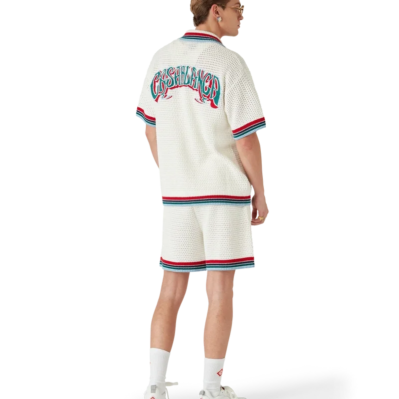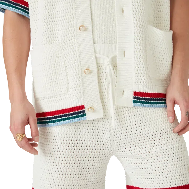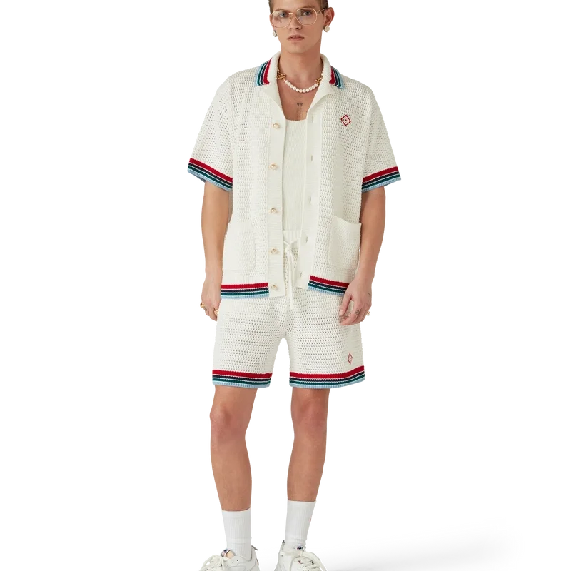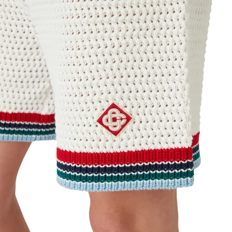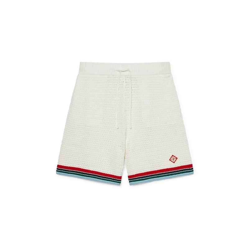 I pantaloncini Gothic Crochet presentano un design dalla texture morbida, realizzati in tessuto di cotone lavorato a maglia, con il caratteristico logo a rombi della Maison. Rifiniti con una cintura elasticizzata a costine con chiusura a coulisse, tasche laterali e dettagli a strisce a contrasto sulle gambe.<!–