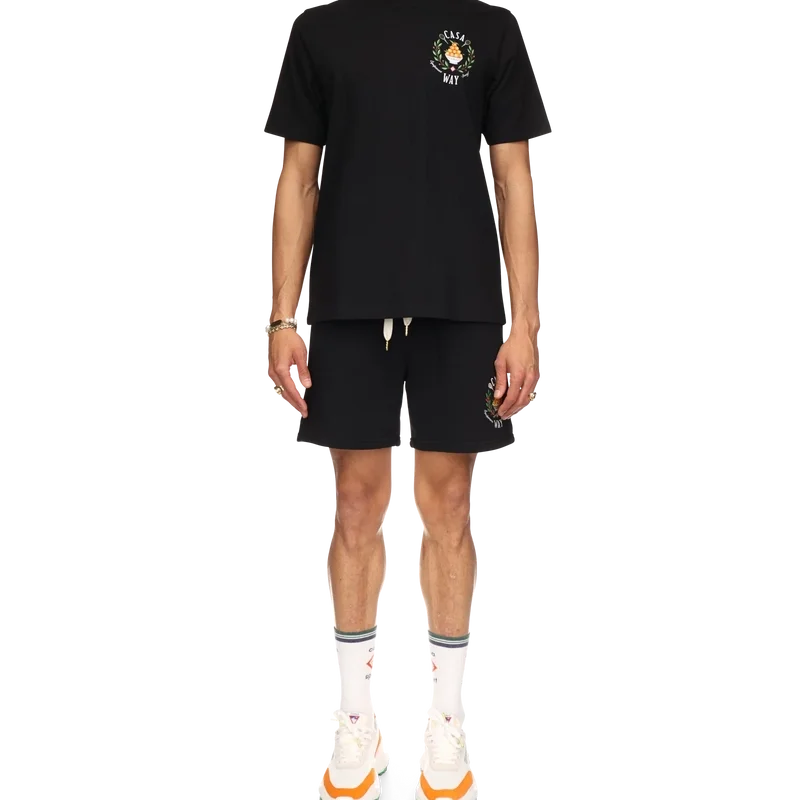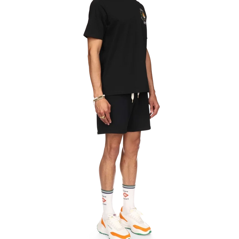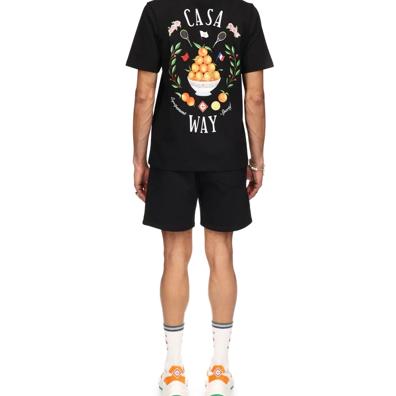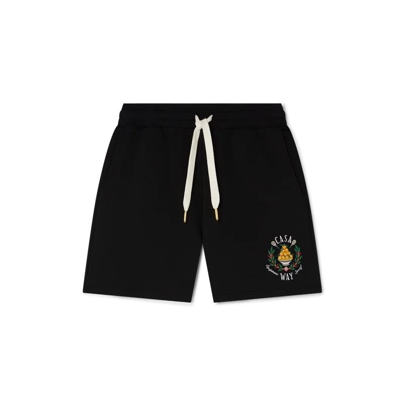 I pantaloncini in felpa Casa Way sono realizzati in cotone biologico e presentano il motivo iconico della Maison con illustrazioni ricamate di attrezzature sportive e dettagli floreali reinterpretati per la stagione. Sono rifiniti con chiusura con coulisse con puntali dorati, tasche laterali oblique e una tasca posteriore.