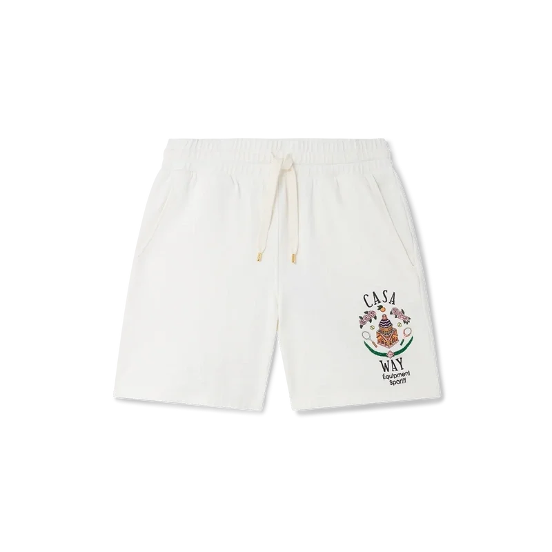 I pantaloncini in cotone biologico bianco sporco Casa Way presentano la grafica distintiva della casa con illustrazioni ricamate di attrezzature sportive e dettagli floreali reinterpretati per questa stagione. Completati da chiusura con coulisse con puntali dorati, tasche laterali ed etichetta con il marchio Casablanca Paris, sono progettati per una vestibilità classica.