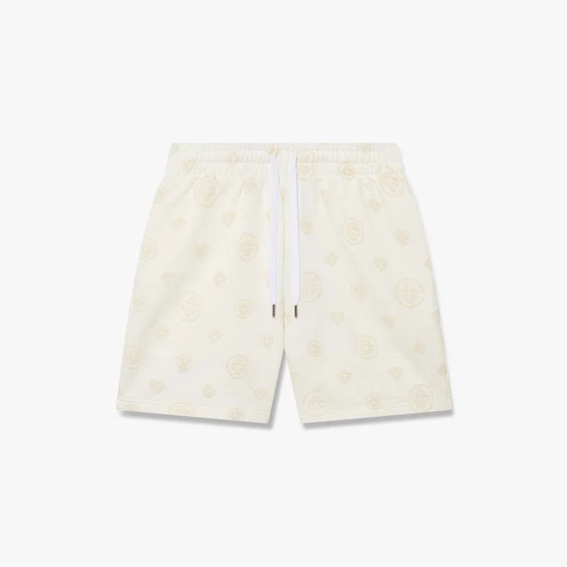 I pantaloncini in felpa con monogramma bianco sporco applicato hanno un design comodo e presentano la stampa del logo Monogram Casablanca, icona della Maison. Sono rifiniti con elastico in vita, chiusura con coulisse, tasche laterali a filetto, fodera e tasca applicata sul retro.
