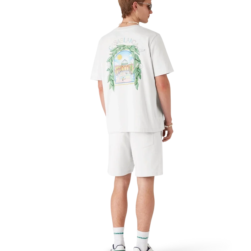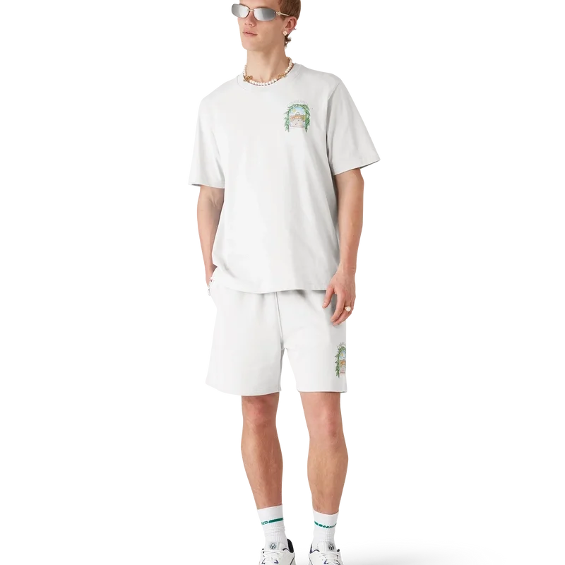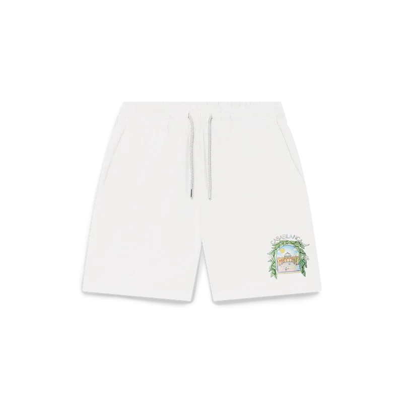 I pantaloncini in felpa Casa L’arche presentano un raffinato motivo stampato che riprende le illustrazioni stagionali della Maison con elementi di design ispirati all’arco, alla natura, all’architettura e al tennis. Sono rifiniti con elastico in vita, coulisse con puntali dorati, tasche laterali e una tasca applicata sul retro.