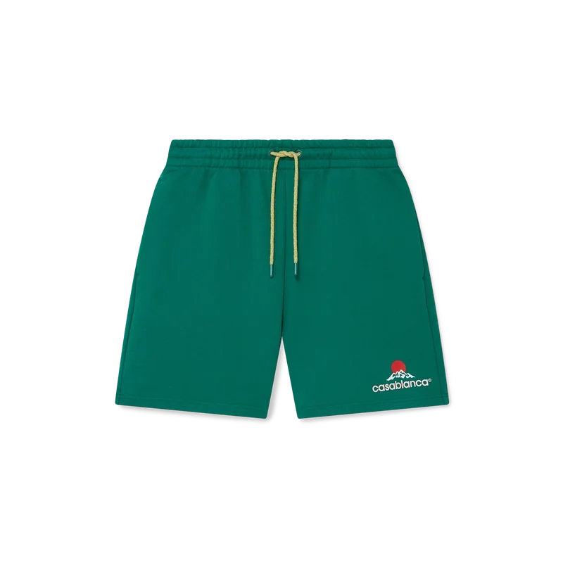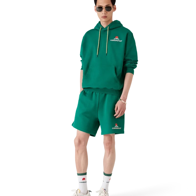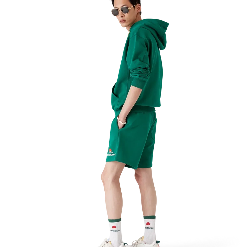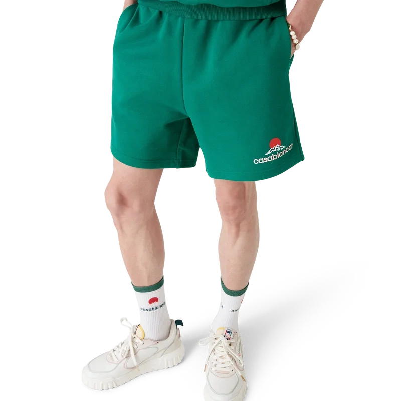 I pantaloncini da ginnastica Casablanca Montagne sono un capo sportivo realizzato in jersey di cotone e impreziosito dalla grafica stagionale della Maison: un logo che a prima vista sembra una montagna, ma che, osservandolo più da vicino, si legge come “Casa”. Sono rifiniti con una cintura elasticizzata, coulisse con estremità dorate, tasche interne e una tasca applicata sul retro.