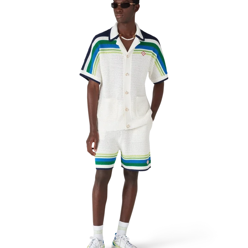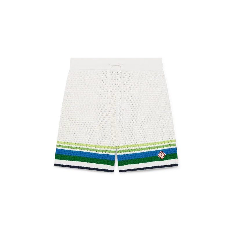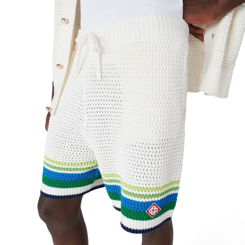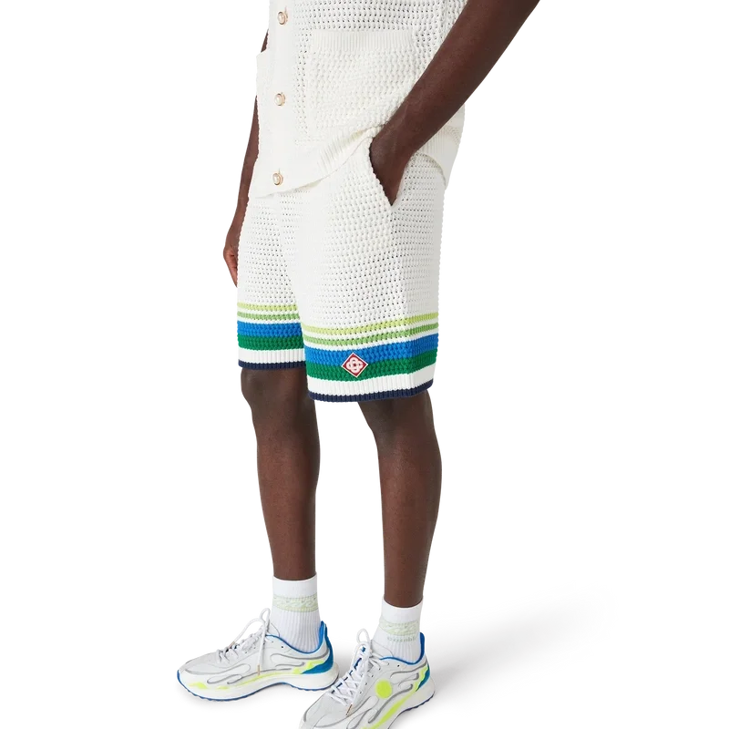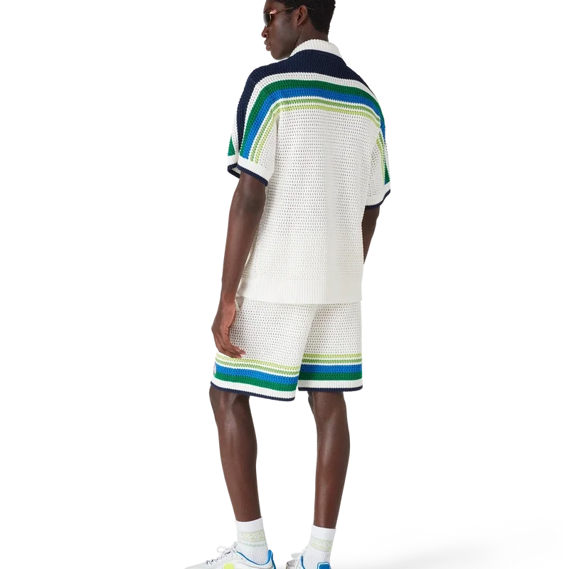 I pantaloncini in maglia a righe presentano un design raffinato e dalla texture morbida, realizzati in tessuto di cotone lavorato all’uncinetto, con il caratteristico motivo a righe da tennis in colori naturali. Rifiniti con una cintura elasticizzata a costine con chiusura a coulisse, tasche laterali e una silhouette morbida.