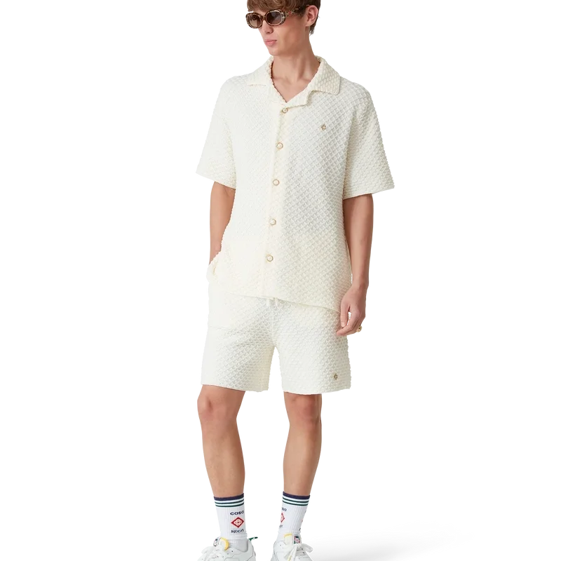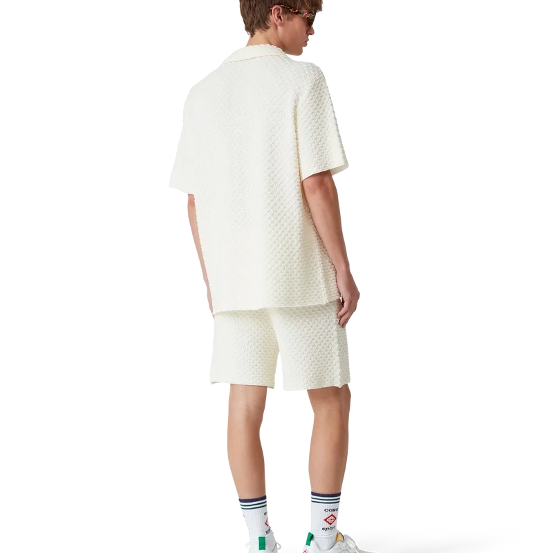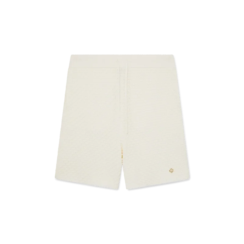 I pantaloncini in maglia testurizzata sono realizzati in tessuto misto cotone con motivo a rombi. Sono rifiniti con elastico in vita, tasche laterali interne, una tasca applicata sul retro e un rivetto CC intrecciato placcato oro.