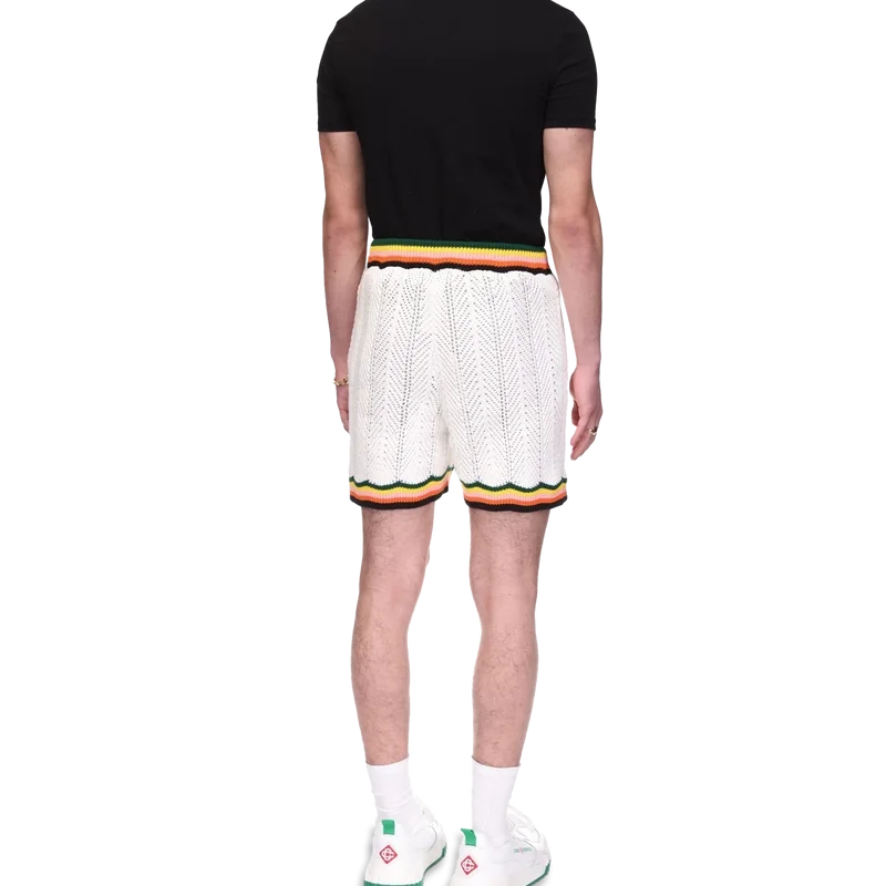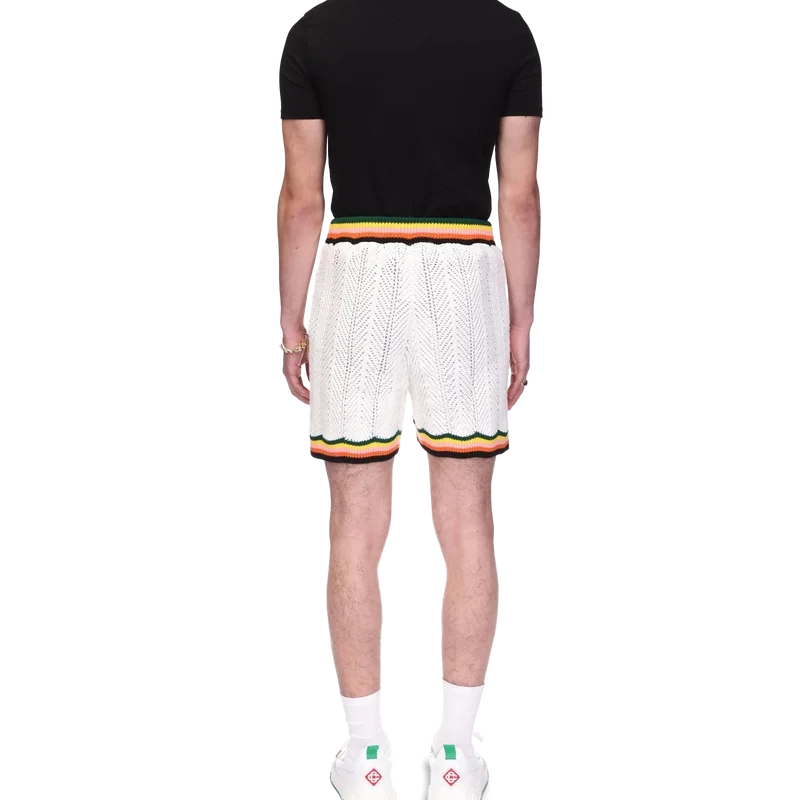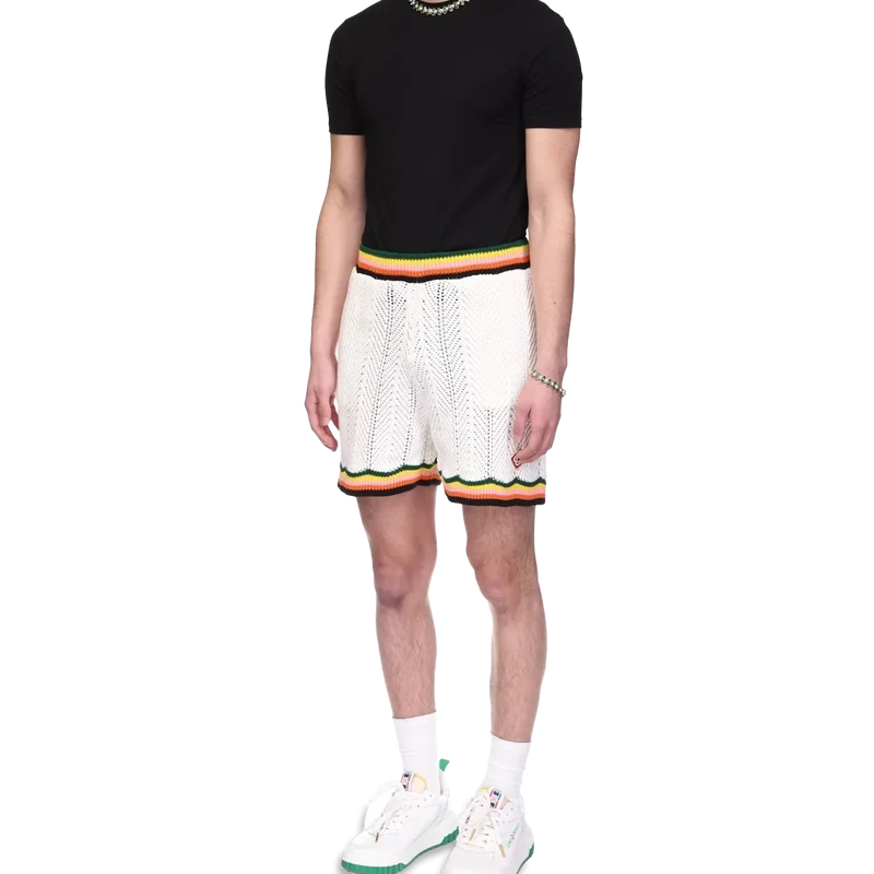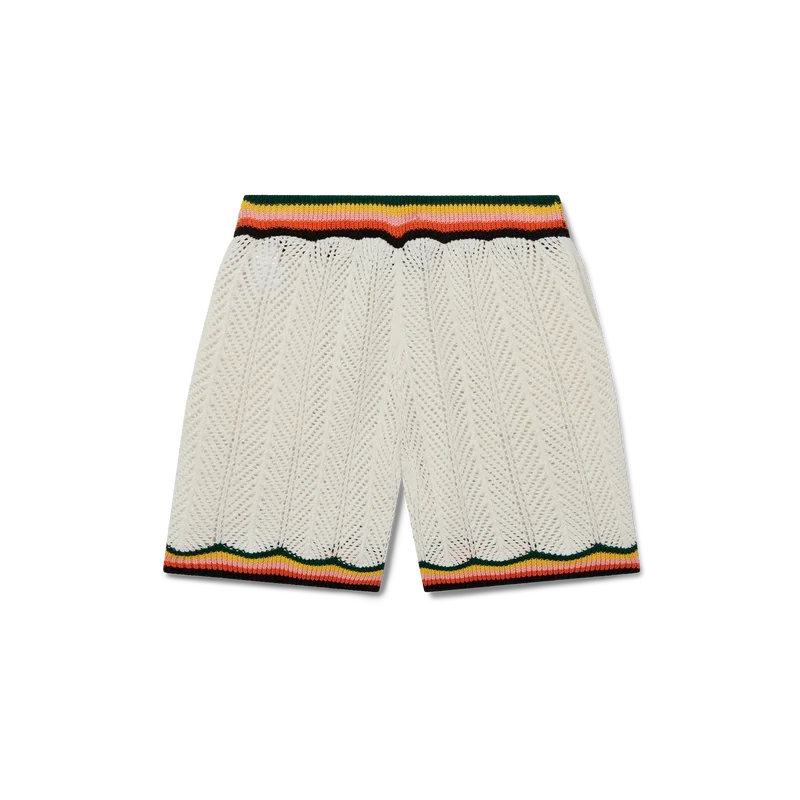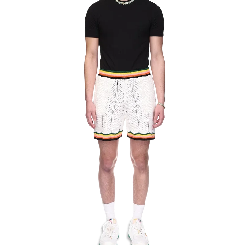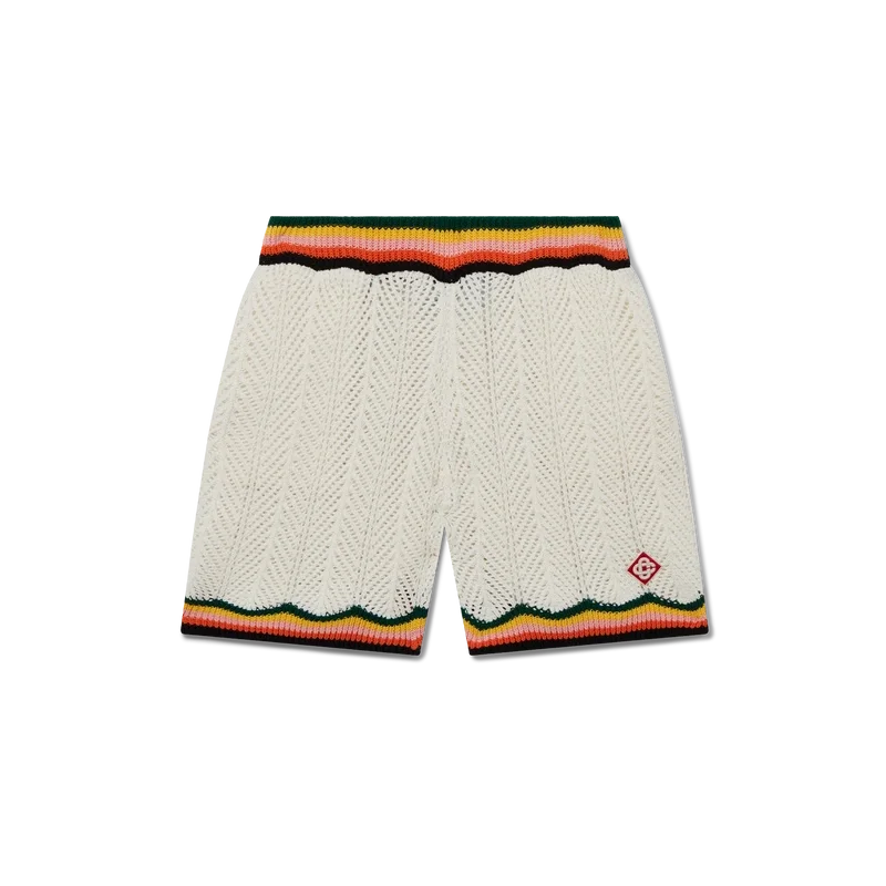 I pantaloncini in pizzo a zig-zag sono realizzati in tessuto di cotone a maglia e presentano il logo a rombo iconico della Maison. Sono rifiniti con un motivo a zig-zag a contrasto intorno alla cintura a costine e all’orlo nei colori di stagione, tasche laterali e chiusura interna con coulisse.