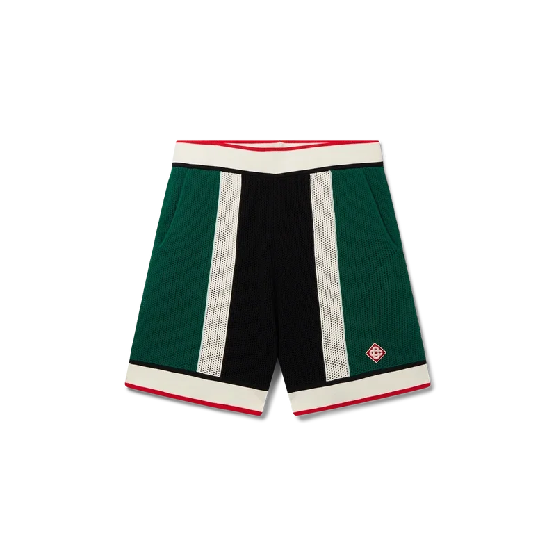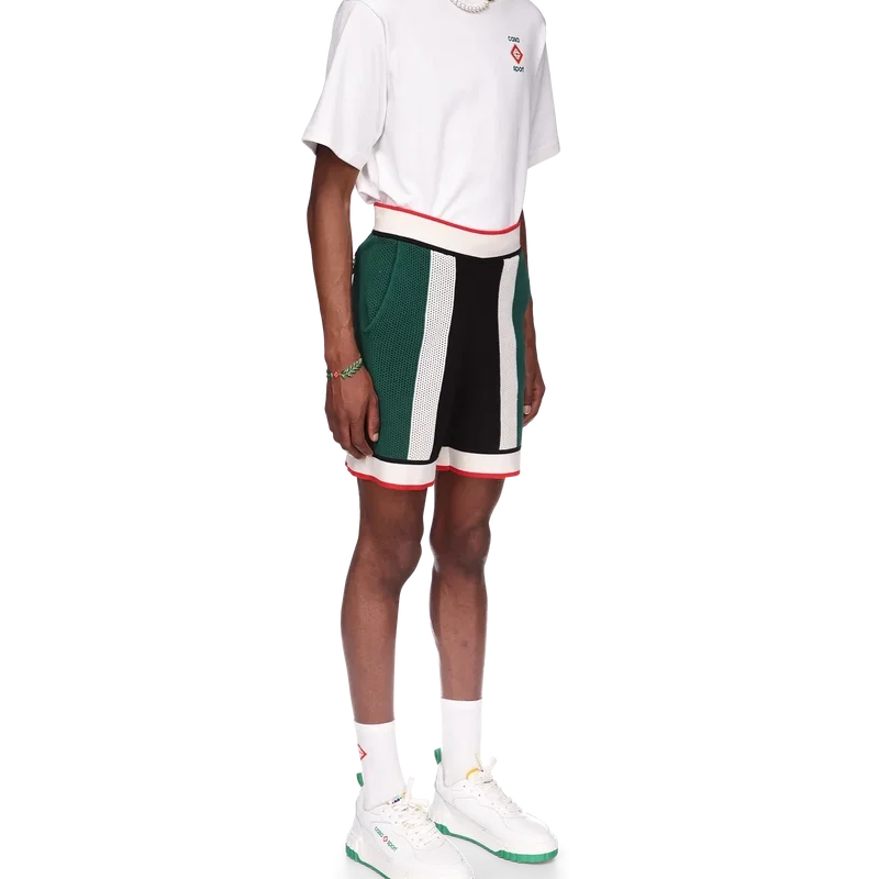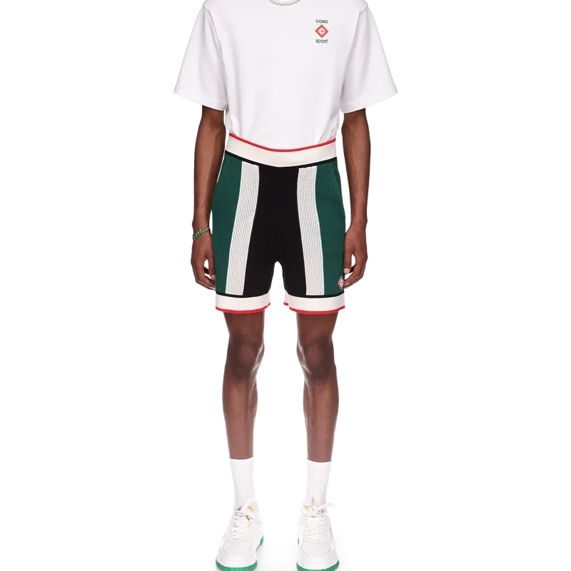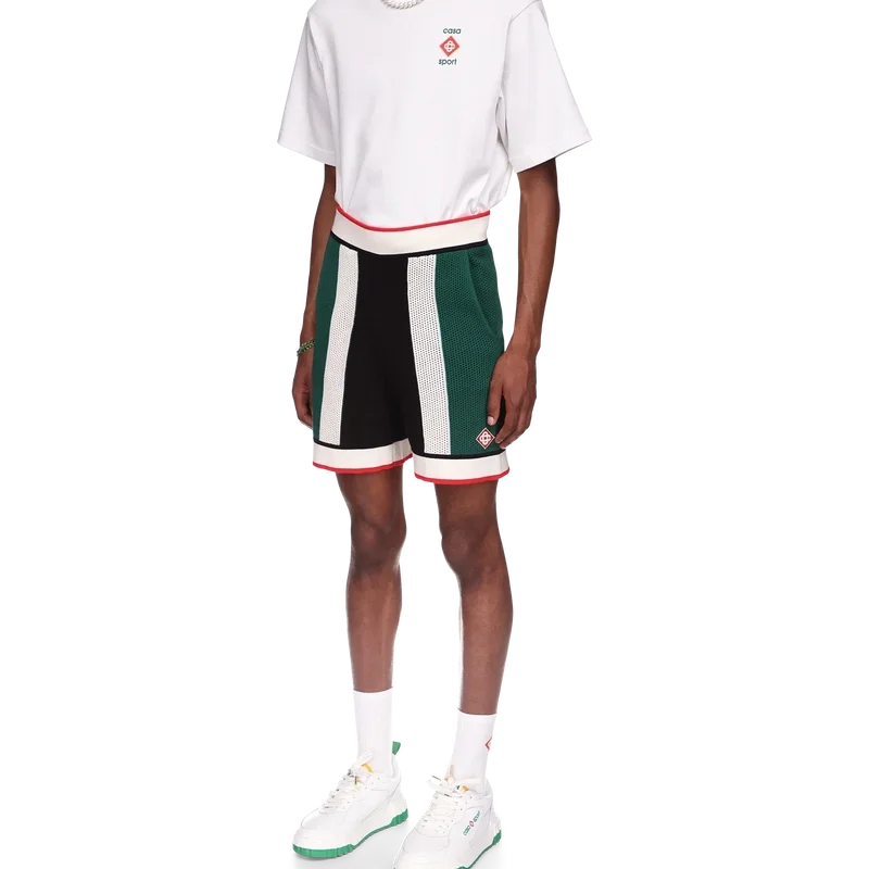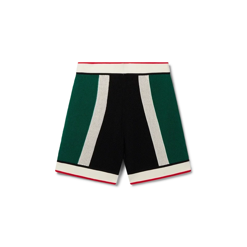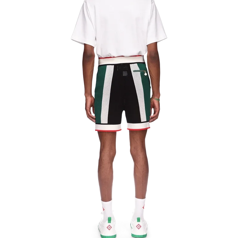 I pantaloncini in rete a righe sono realizzati in tessuto di cotone biologico a maglia, ispirati ai colori della bandiera della Nigeria e presentano la toppa con il logo a diamante della Maison. Completati da cintura e orlo a costine, tasche laterali oblique e una tasca posteriore con chiusura a zip.