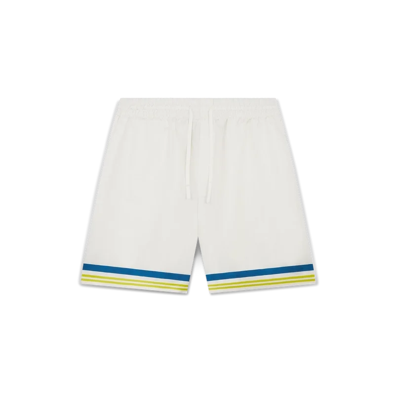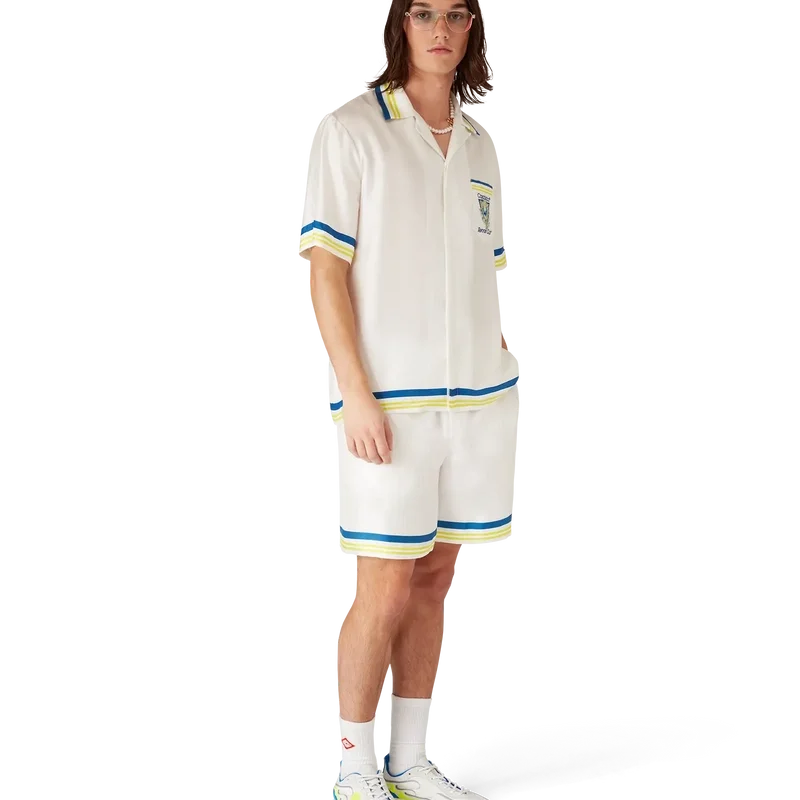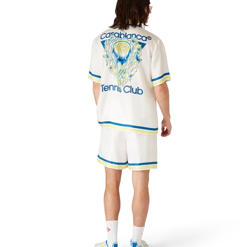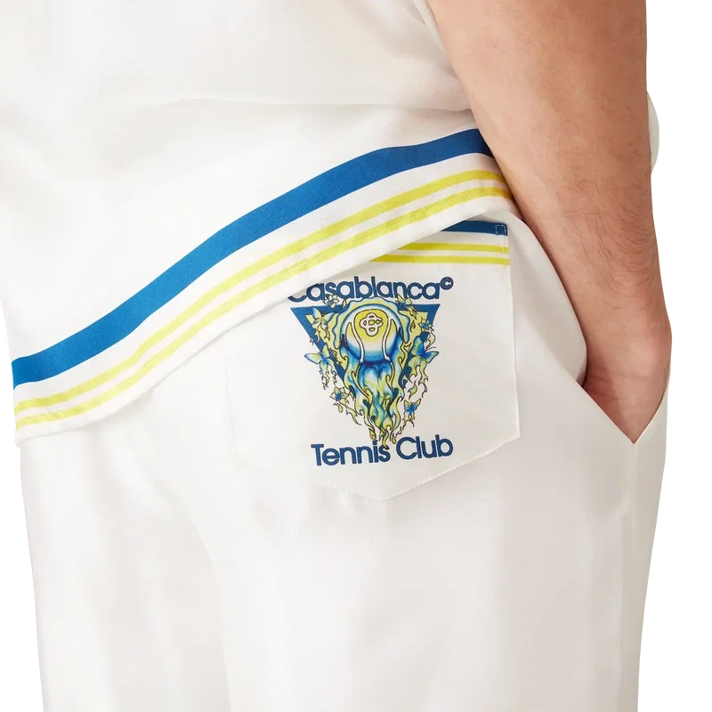 I pantaloncini in seta con icona Flaming Tennis Club presentano un design stampato con il caratteristico motivo della pallina da tennis in volo della Maison, che riflette l’equilibrio fondamentale tra potenza, velocità e controllo. Sono rifiniti con elastico in vita, chiusura con coulisse, tasche laterali interne e una tasca applicata sul retro.