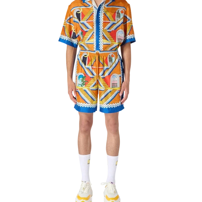 I pantaloncini da uomo in seta Escalier Infini presentano la radiosa grafica della scala infinita di questa stagione. Rifiniti con un bordo a zig-zag blu e bianco a contrasto e cintura con coulisse.