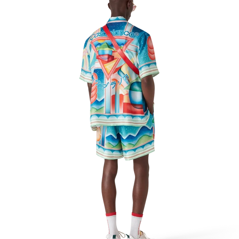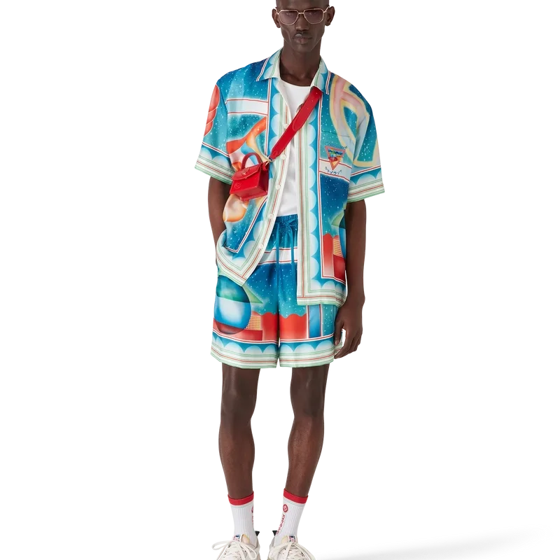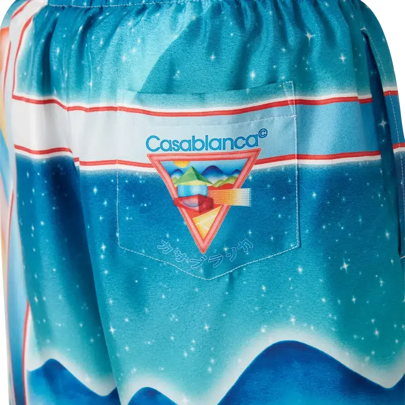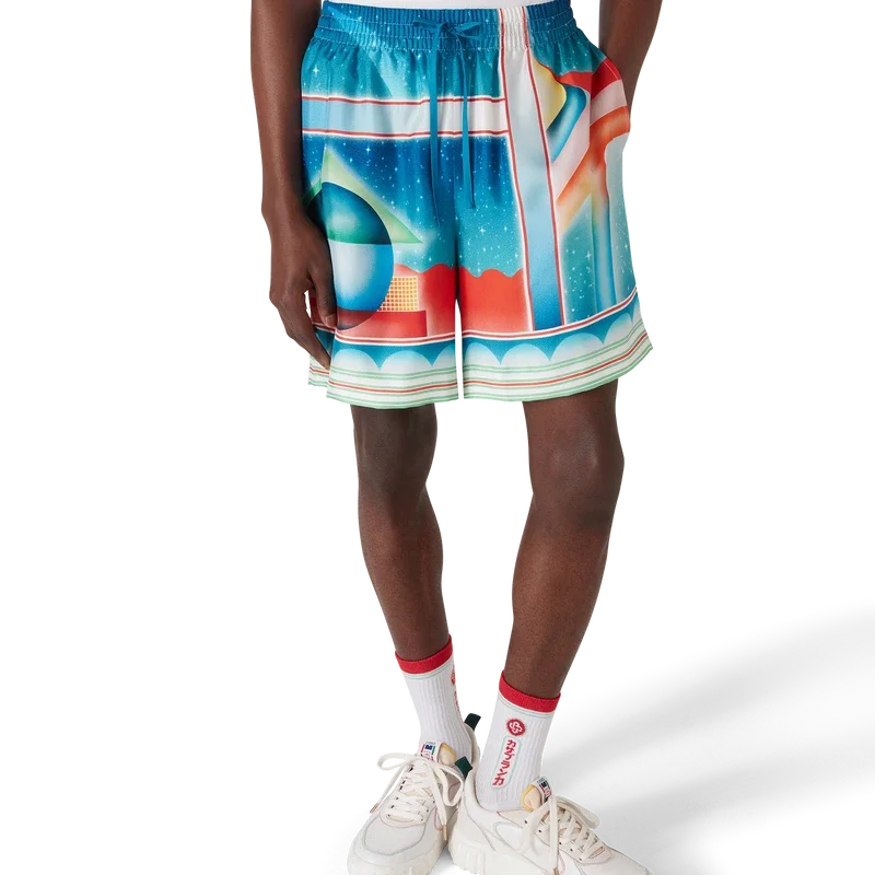 I pantaloncini in seta Galaxy Court presentano una stampa all-over e sono realizzati in twill di seta. Sono dotati di elastico in vita, chiusura con coulisse, fodera, tasche laterali a filetto e tasca posteriore.