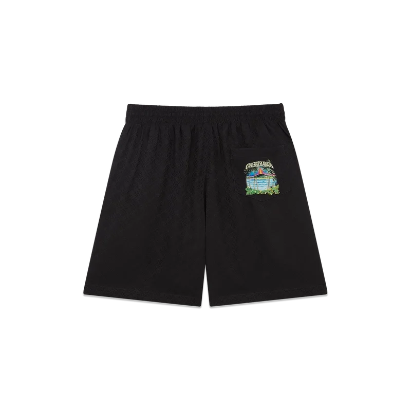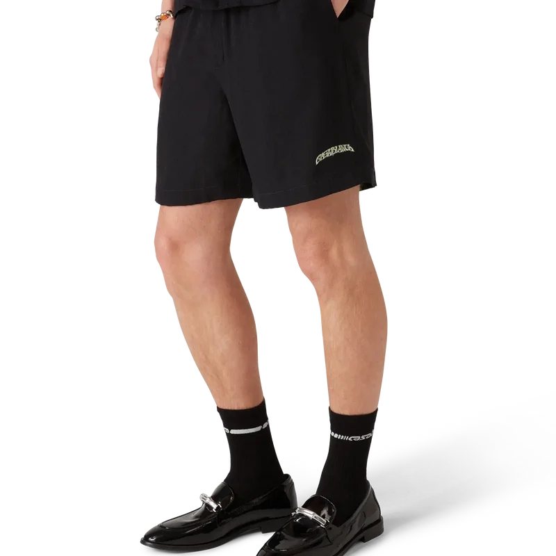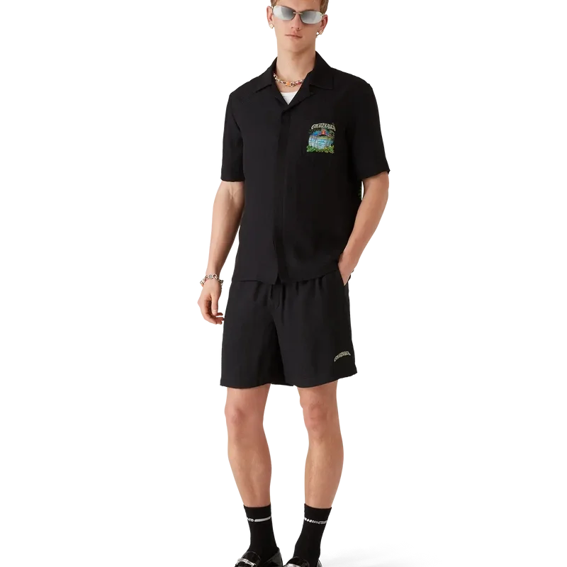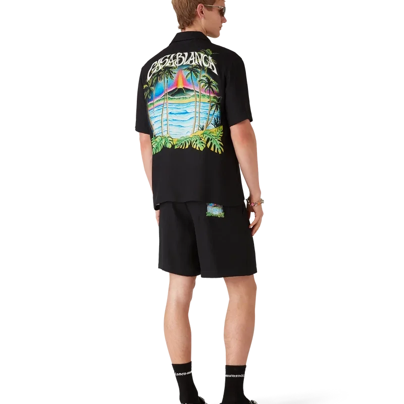 I pantaloncini in seta Volcano presentano un design raffinato con la grafica di stagione di un vulcano che si profila in modo drammatico dietro palme a mezzo profilo, in piena eruzione, la cui energia ardente contrasta nettamente con la scena serena e tranquilla in primo piano. Completati da una cintura elasticizzata, chiusura con coulisse, tasche laterali interne alla cucitura, una tasca applicata sul retro e una silhouette comoda che incarna l’approccio di lusso del marchio all’abbigliamento casual.