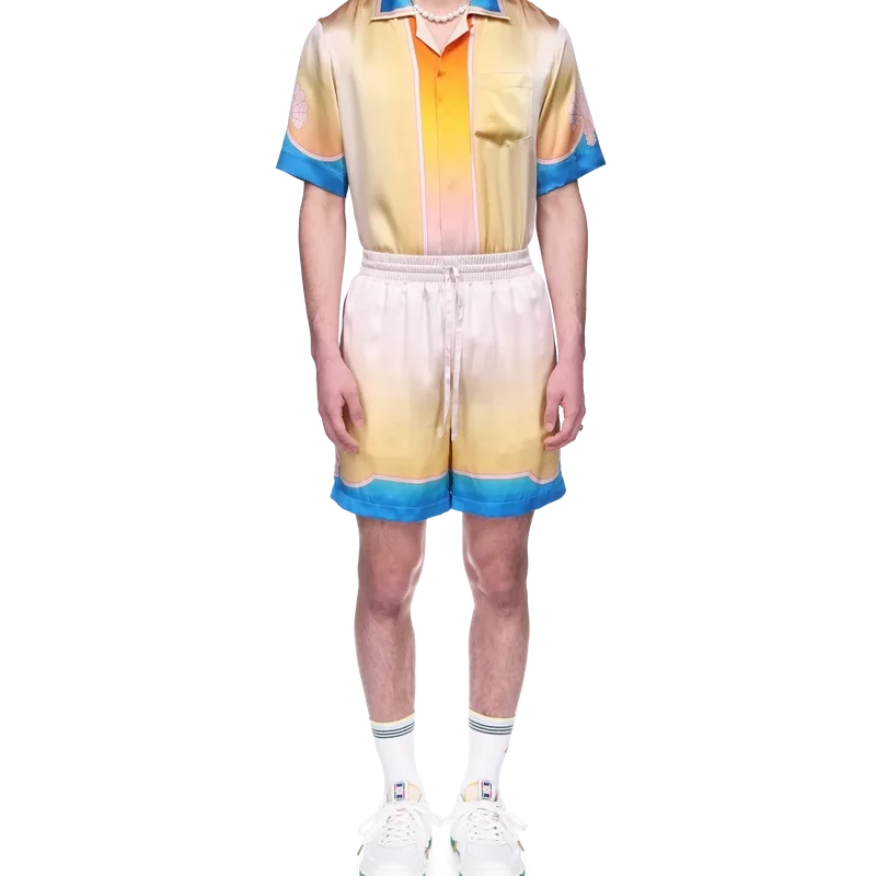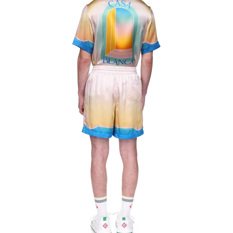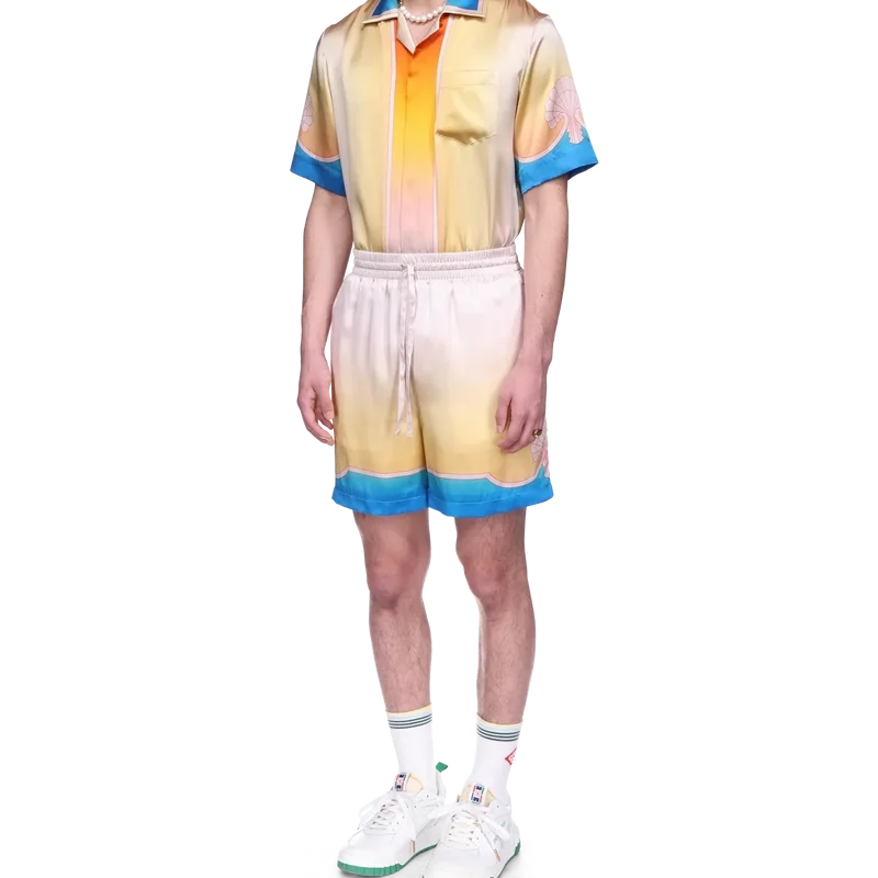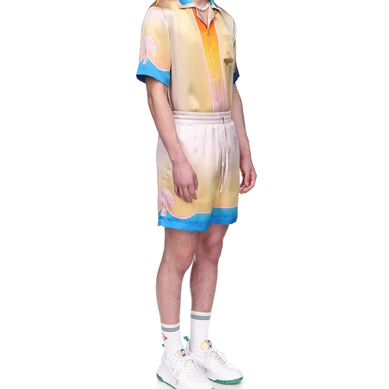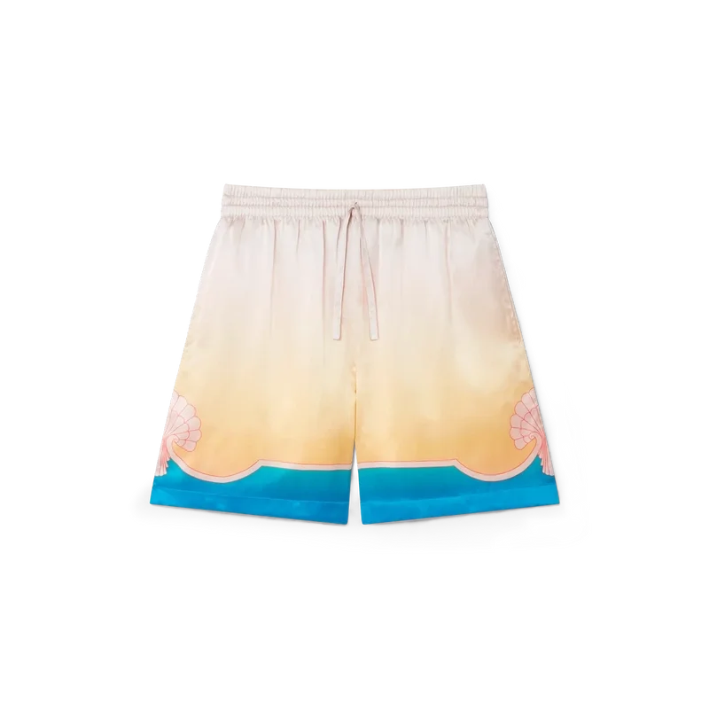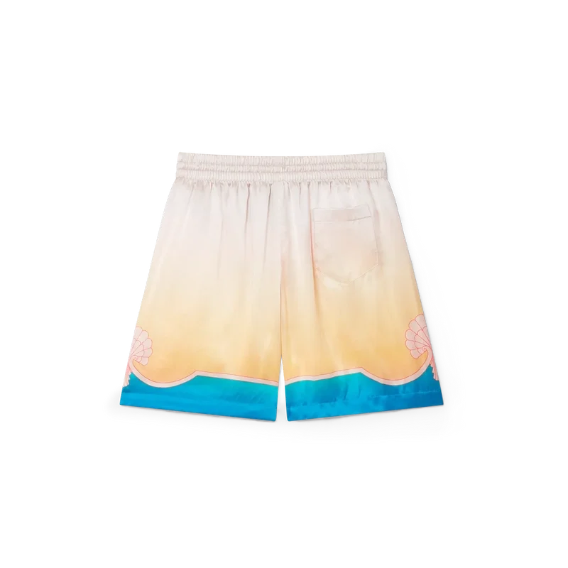 I pantaloncini in seta L’arc Colora presentano un design iconico, realizzati in raso di seta stampato e caratterizzati dalla stampa sfumata e dal motivo a conchiglia distintivi della Maison. La palette di colori di questa collezione è leggera e idealistica, e sottolinea i temi eterei che sono al centro del nostro marchio. Completati da dettagli a strisce che formano motivi a conchiglia sull’orlo, una cintura elasticizzata con chiusura a coulisse, tasche laterali e una tasca posteriore.