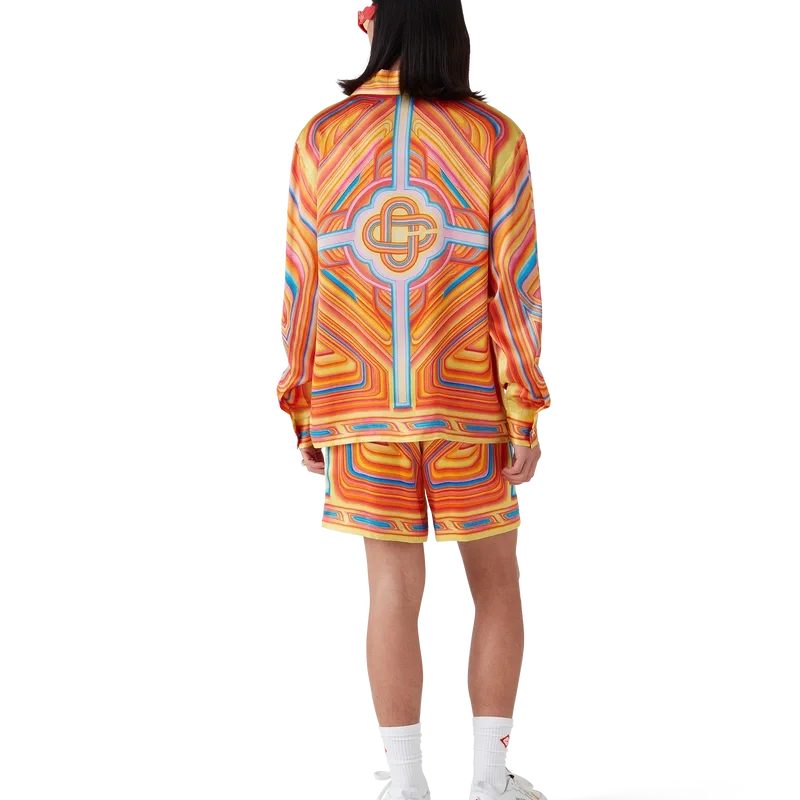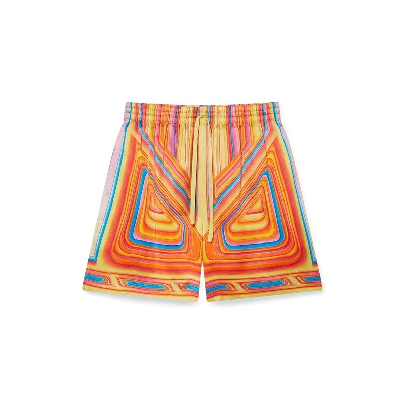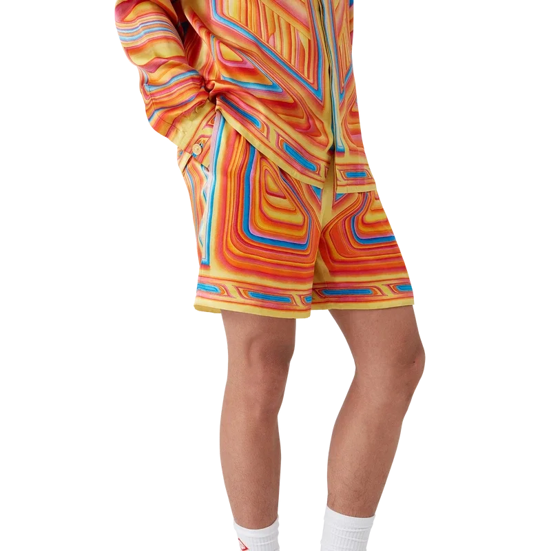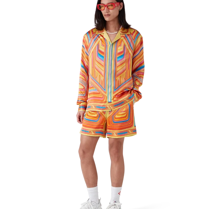I pantaloncini Low Rider in seta presentano una stampa all-over realizzata su tessuto di raso di seta con il motivo stagionale della Maison, che richiama i colori pop e le tecniche di aerografia utilizzate sulle auto Low-Rider, con il logo Casablanca. Completati da elastico in vita, tasche laterali a filetto, tasca applicata posteriore, chiusura con coulisse e fodera.