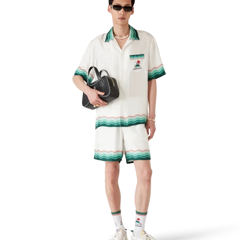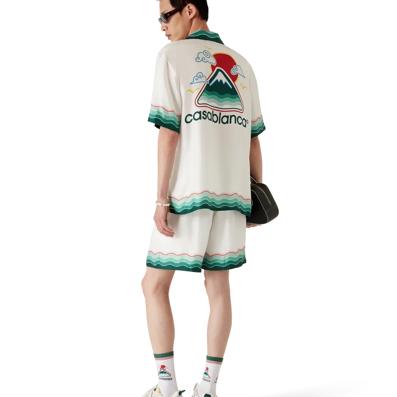 La camicia in seta Montagne Ondulee è un modello a maniche corte con stampa all-over che riproduce l’opera d’arte stagionale della Maison – Ispirandosi alla ricca iconografia giapponese per questa collezione, con un layout e un’opera d’arte semplici, trasmette un forte messaggio visivo con poche linee e colori, rendendola uno degli emblemi della collezione – Realizzata in twill di seta. Completato da una cintura elasticizzata, chiusura con coulisse, tasche laterali interne alla cucitura, una tasca posteriore e dettagli a strisce ispirati alle onde di Memphis sull’orlo e sulla tasca posteriore.