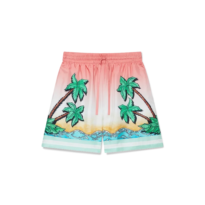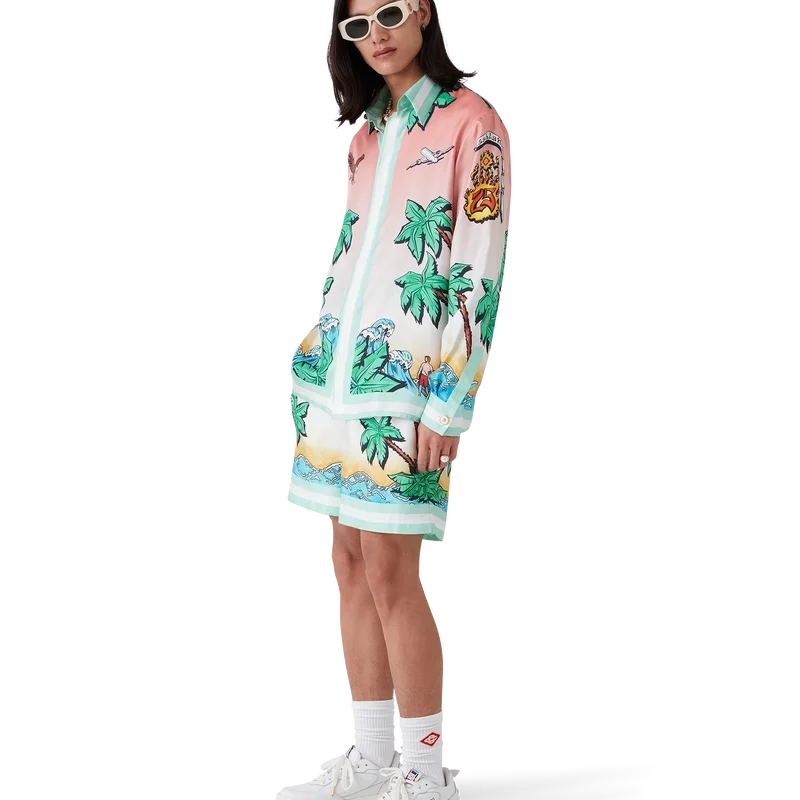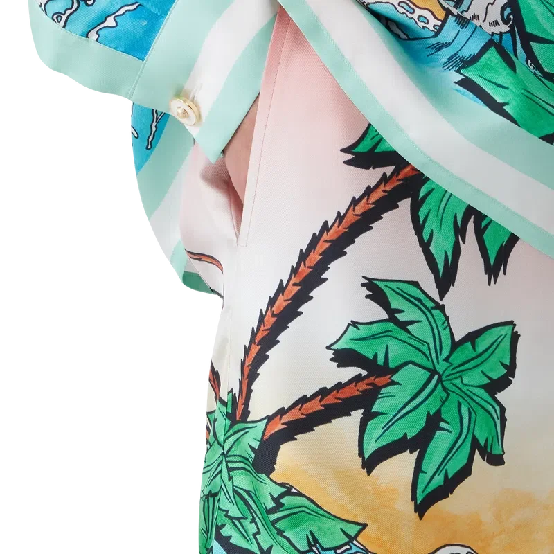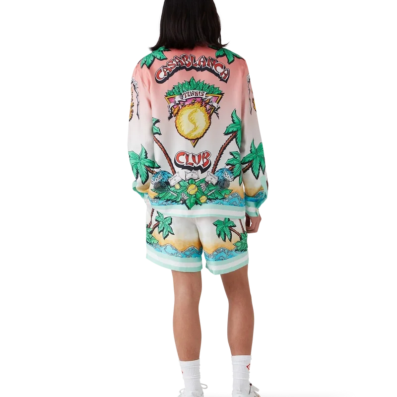 I pantaloncini Tennis Club in seta presentano una stampa all-over con un disegno che reinterpreta la stampa Tennis Club della Maison in chiave surf, nello stile di uno schizzo grafico realizzato con pennarelli, realizzati in tessuto twill di seta. Rifiniti con elastico in vita, chiusura con coulisse, tasche laterali a filetto, tasca applicata sul retro e dettaglio sull’orlo.