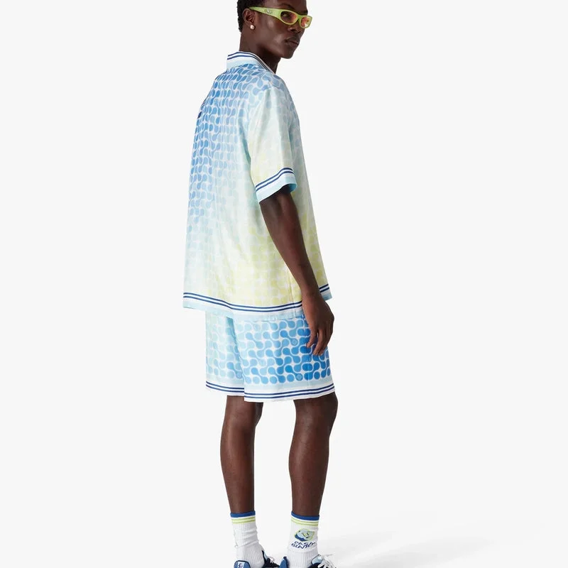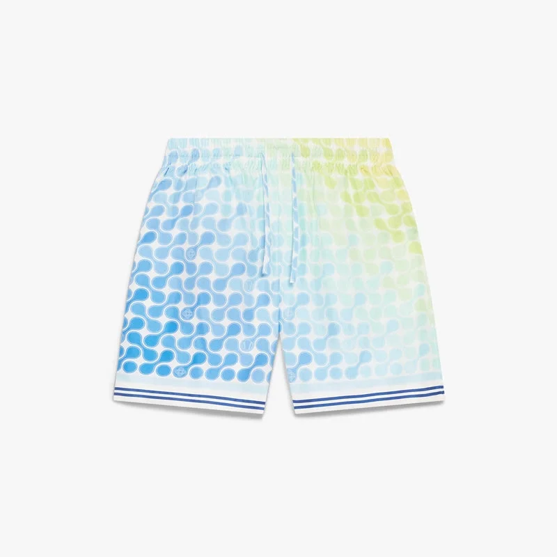 I pantaloncini in seta Tennis Tile presentano un design raffinato, caratterizzato dalla grafica della stagione con un motivo ondulato di loghi e palline da tennis intrecciati su uno sfondo sfumato. Completati da elastico in vita, chiusura con coulisse, tasche laterali interne, tasca posteriore applicata e orlo a righe.