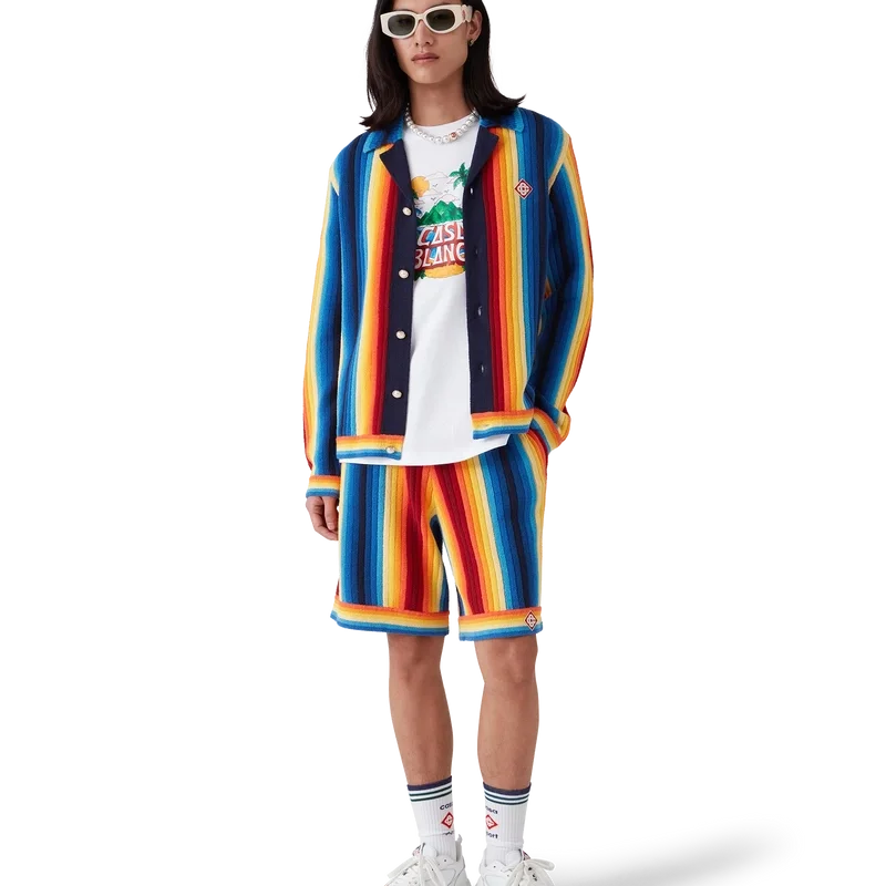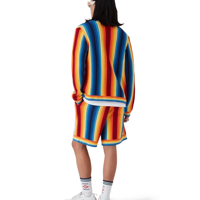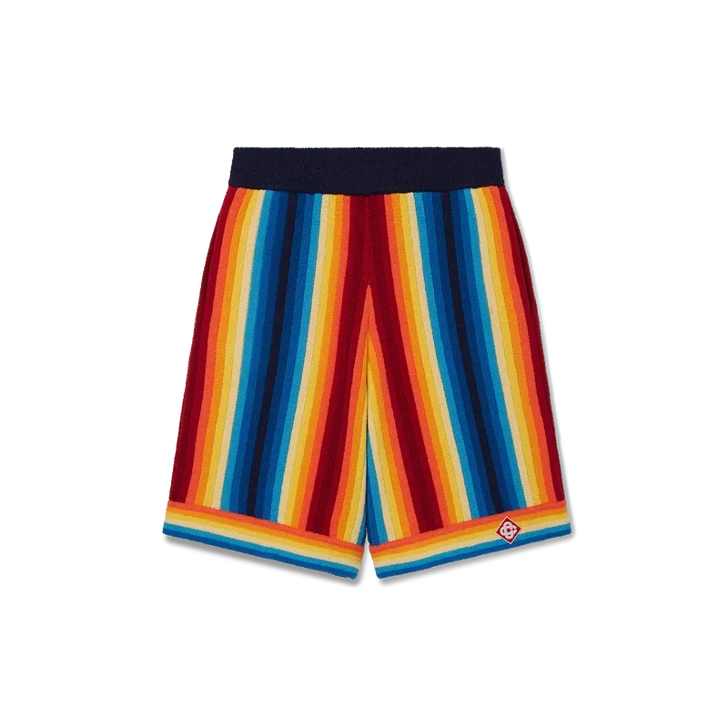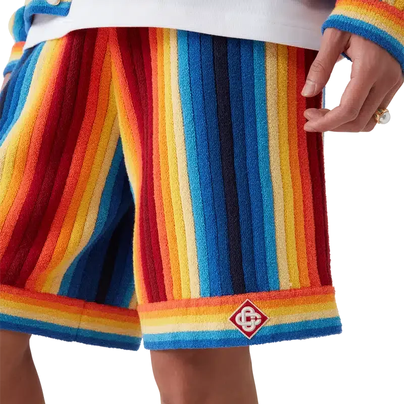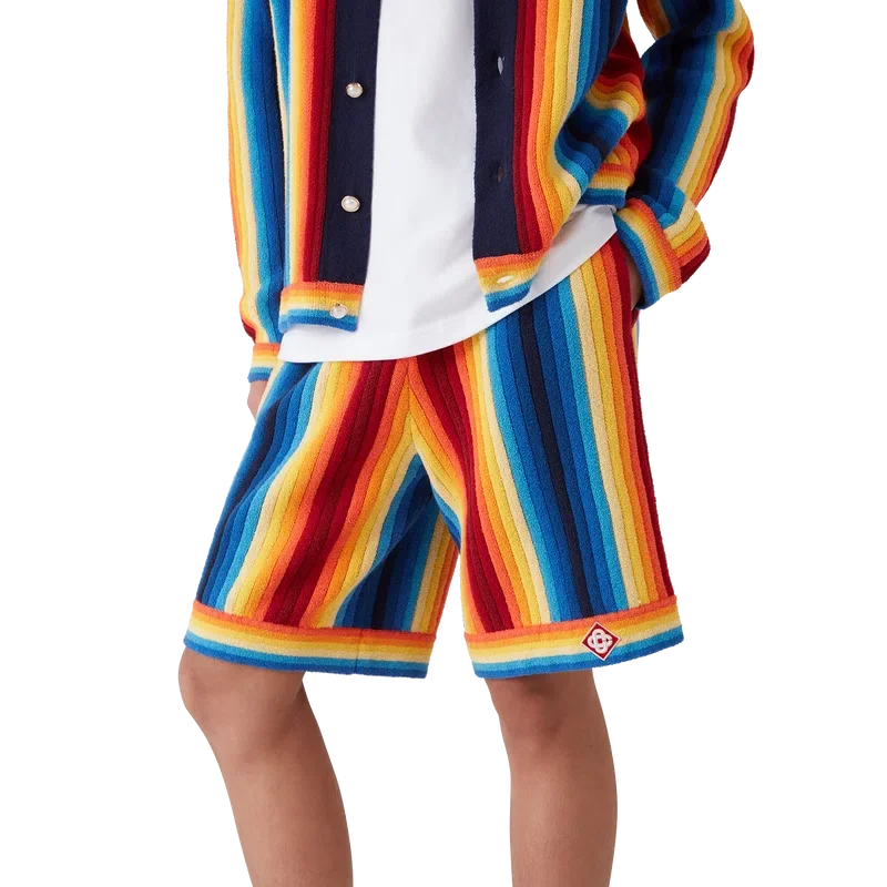 I pantaloncini in spugna a righe sfumate sono un modello al ginocchio realizzato in tessuto spugna a maglia sfumato. Sono rifiniti con elastico in vita, chiusura con coulisse, tasche anteriori oblique e orlo con dettagli a righe orizzontali.
