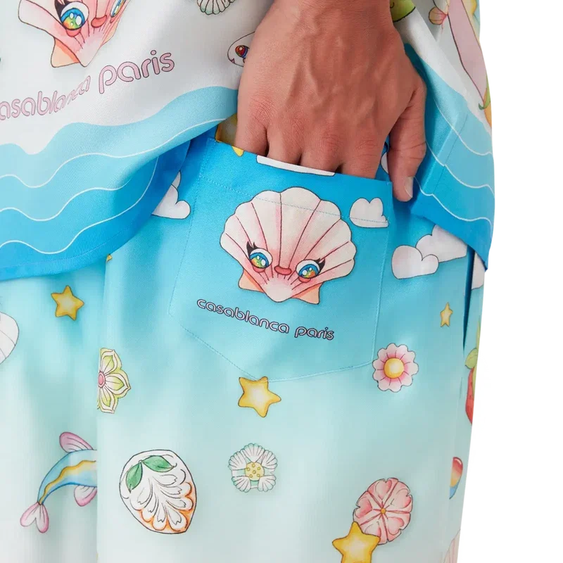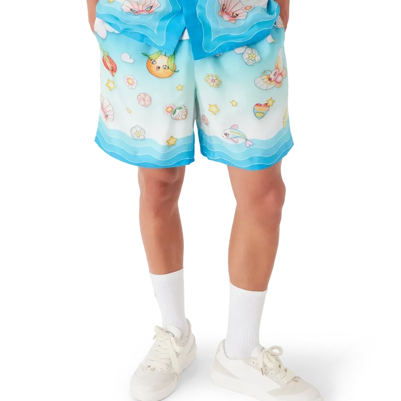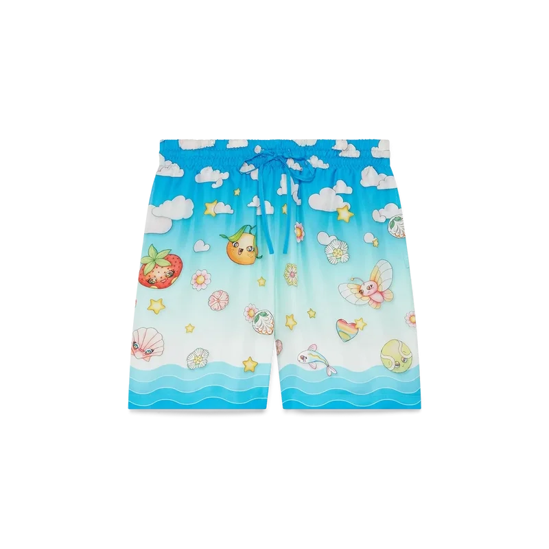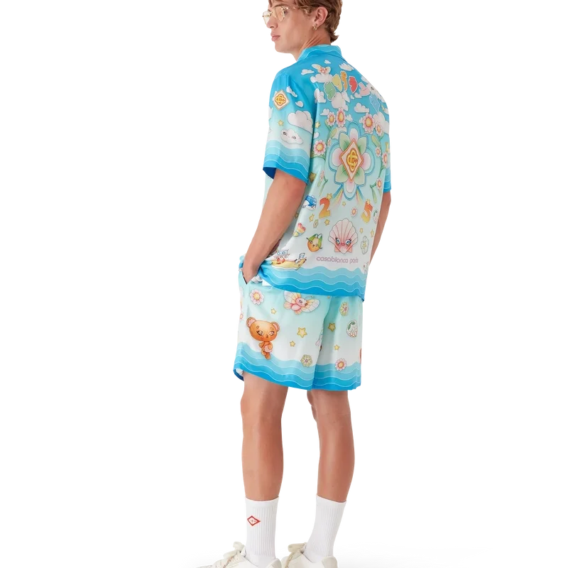 I pantaloncini in twill di seta con motivo Kawaii presentano una stampa all-over con elementi Kawaii. Si tratta di una versione Kawaii del nostro modello Tennis Club, con elementi Kawaii al centro. La palette di colori di questa camicia è essenzialmente composta da tonalità pastello.