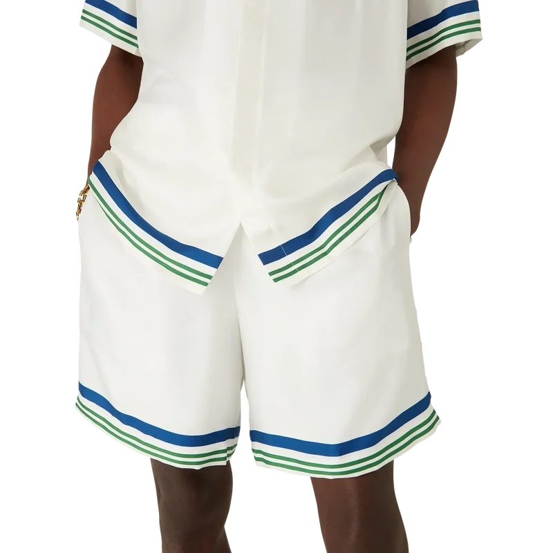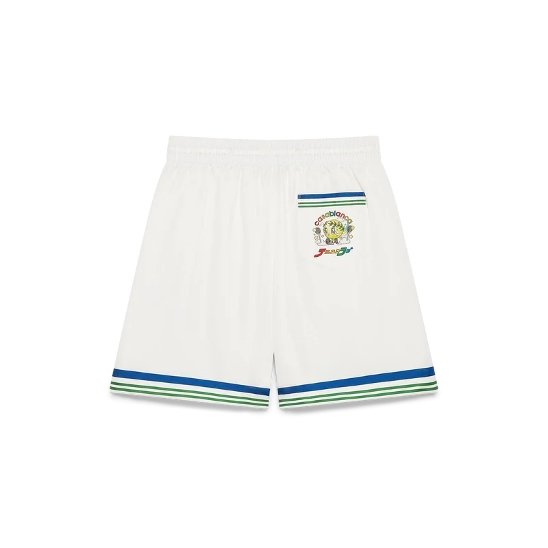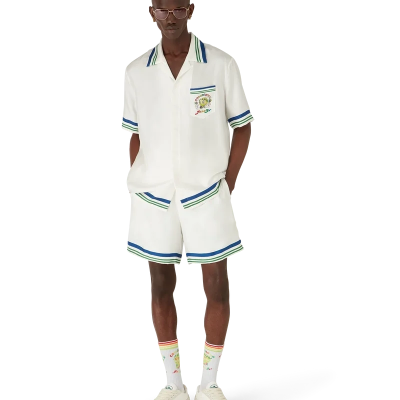 I pantaloncini in twill di seta Tennis Club Icon presentano un motivo stampato con l’immagine stagionale della pallina da tennis Kawaii: questo personaggio è una parte fondamentale del nostro universo. Incorpora elementi come la foglia d’alloro, la sneaker Atlantis, la racchetta e gli occhi Kawaii. Abbiamo scelto di mettere in primo piano questo personaggio come motivo centrale per tutti i modelli da uomo della collezione. Completati da un elastico in vita, chiusura con coulisse, tasche laterali interne alla cucitura, una tasca applicata sul retro e dettagli a strisce blu, bianche e verdi sul bordo della tasca posteriore.