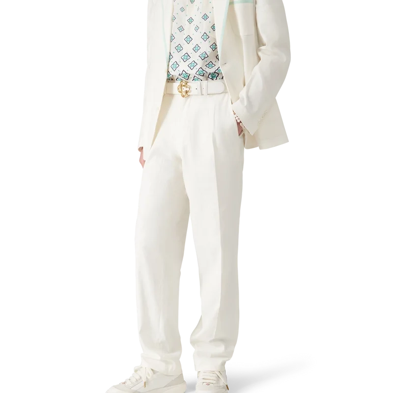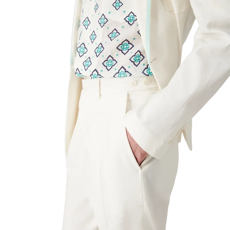 I pantaloni a pieghe in lino hanno un design affusolato e sono realizzati in tessuto di lino. Sono dotati di chiusura con cerniera, tasche anteriori oblique, tasche posteriori a filetto, passanti per cintura e pieghe.