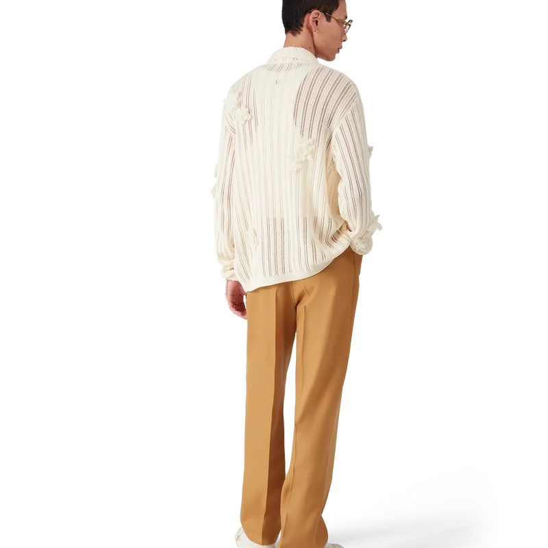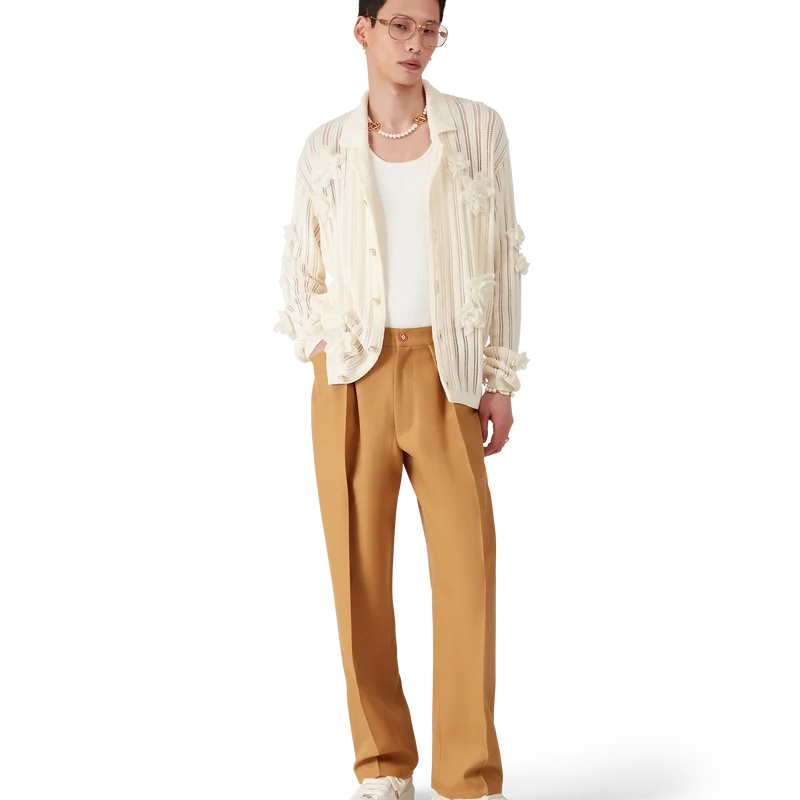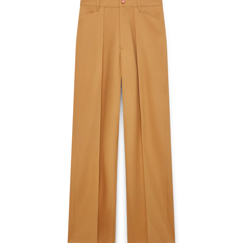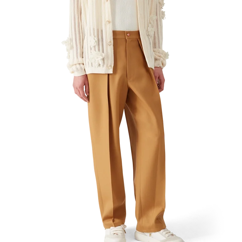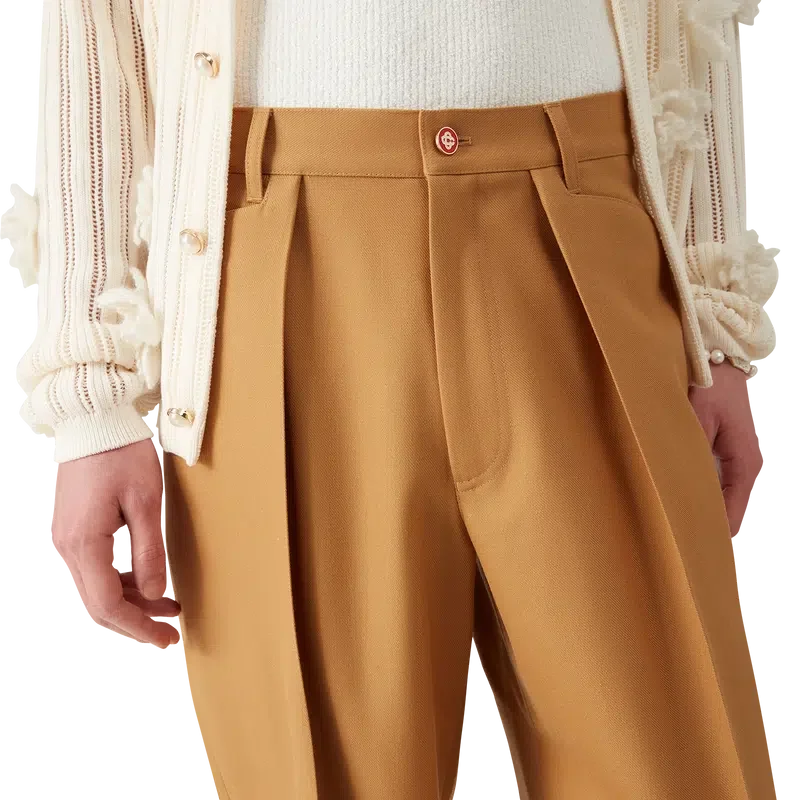 I pantaloni chino a pieghe presentano un design a gamba affusolata, sono realizzati in tessuto di lana e presentano una fodera in misto cotone. Sono rifiniti con passanti per cintura, chiusura con cerniera, tasche anteriori, una piega diagonale e tasche posteriori a filetto con chiusura a bottone smaltato con bordo dorato e logo CC intrecciato.<!–