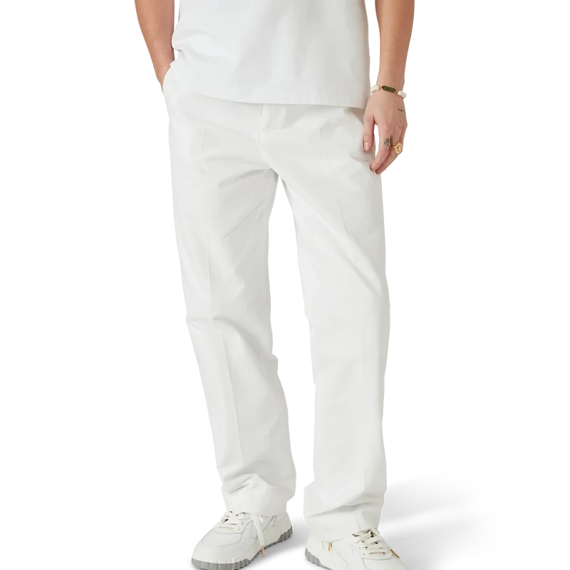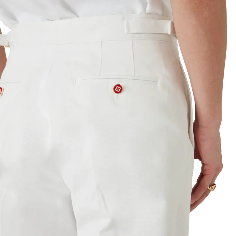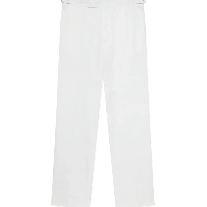 I pantaloni chino sartoriali presentano un taglio dritto, sono realizzati in tessuto di cotone e hanno una fodera in cotone. Sono rifiniti con tasche interne, chiusura con cerniera, regolatori laterali con fibbie placcate in oro e tasche posteriori a filetto con chiusura a bottone.