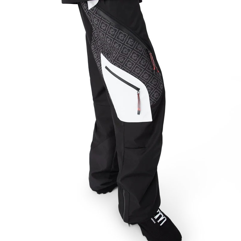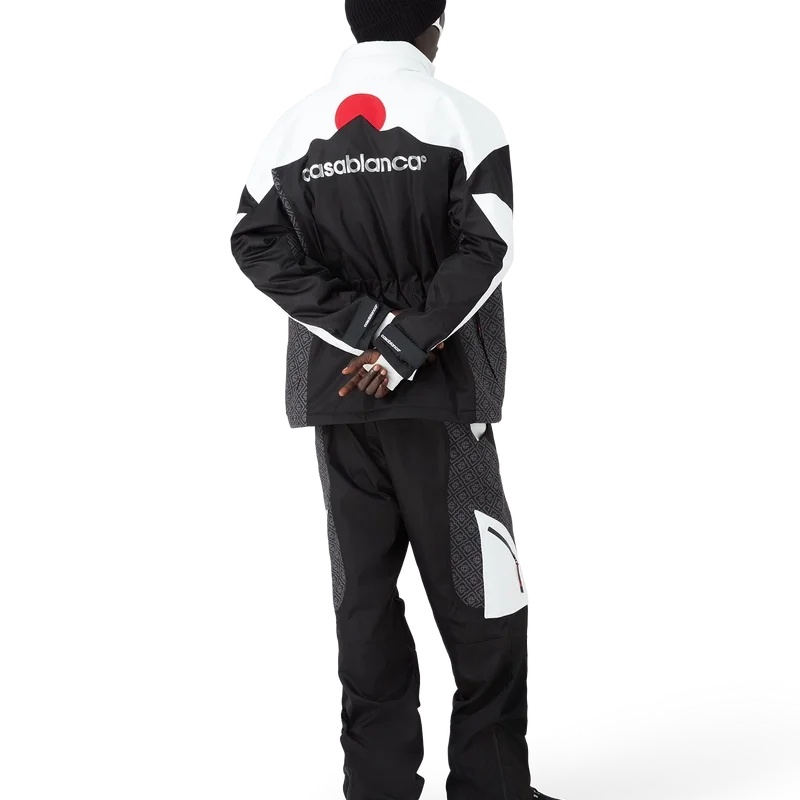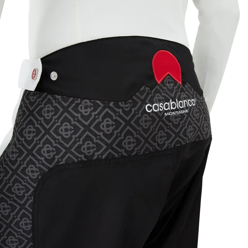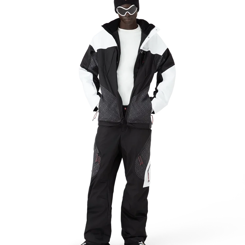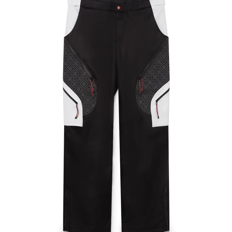 I pantaloni da sci sono un raffinato modello Apras-Sport realizzato in tessuto ripstop bianco e nero con monogramma a contrasto, ispirato alla bellezza grafica della campagna invernale giapponese, dove i motivi tradizionali riecheggiano attraverso i paesaggi innevati. Si ispira alla geometria ritmica dell’architettura rurale e al forte contrasto delle strutture in legno scuro con i brillanti campi innevati. Completati da chiusura con zip, tasche applicate con chiusura a zip dotate di linguette elastiche, dettagli metallici placcati argento e chiusura con zip alle caviglie.