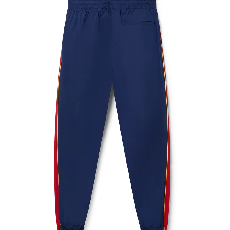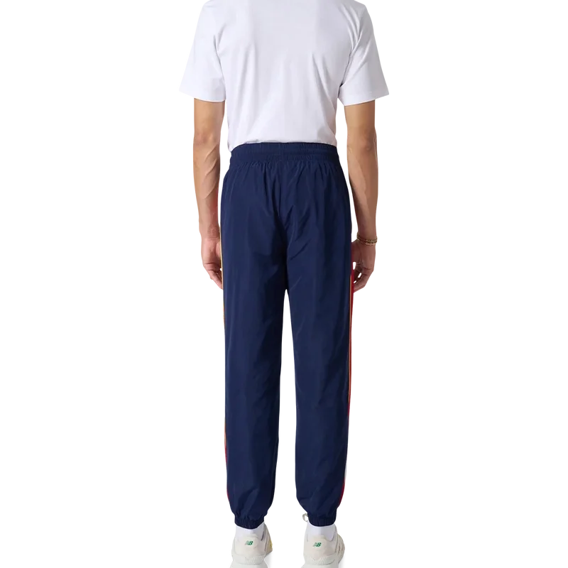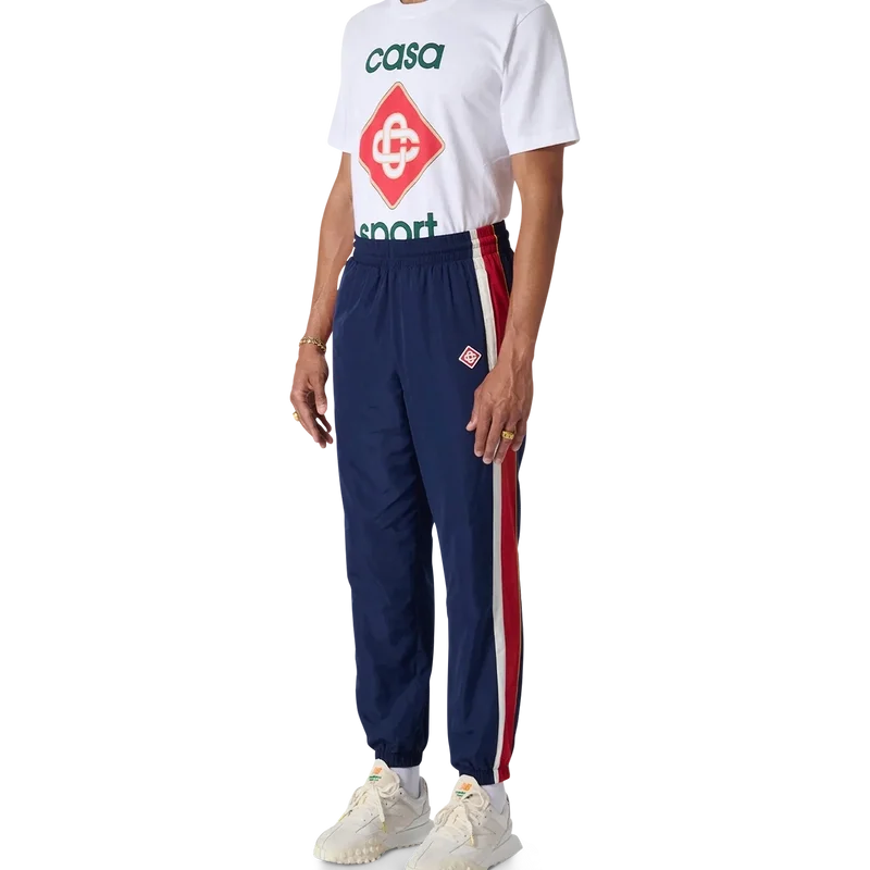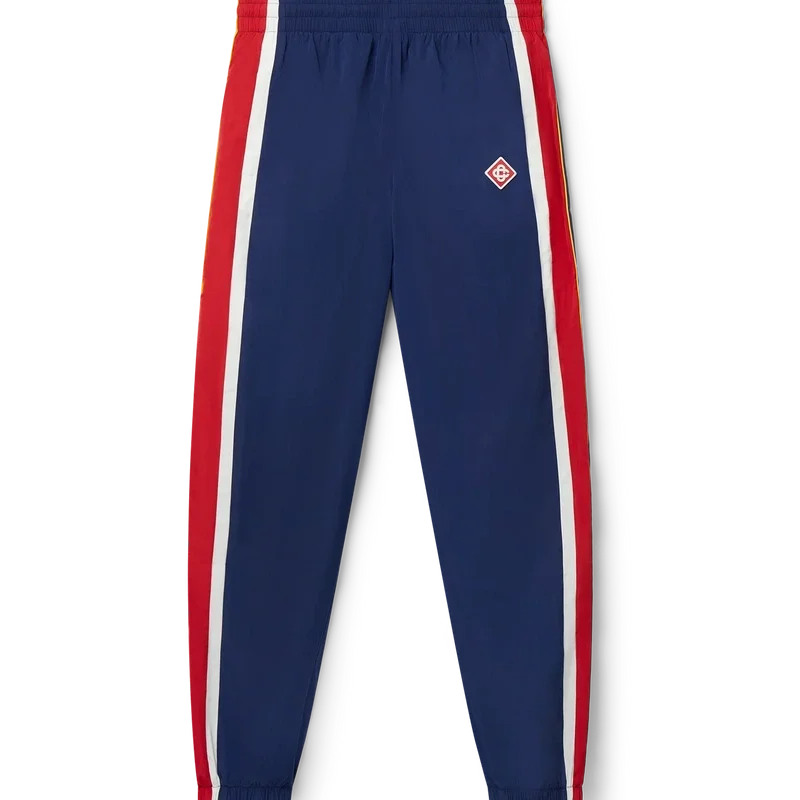 I pantaloni da tuta con pannelli ad arco sono pantaloni sportivi dal gusto nostalgico realizzati in taffetà di poliestere con pannelli nei toni del bianco, rosso e blu navy. Rifiniti con coulisse con puntali dorati, polsini elasticizzati e tasche laterali. Progettati per una vestibilità classica con il logo Diamond Monogram Casablanca Paris ricamato sulla gamba sinistra.