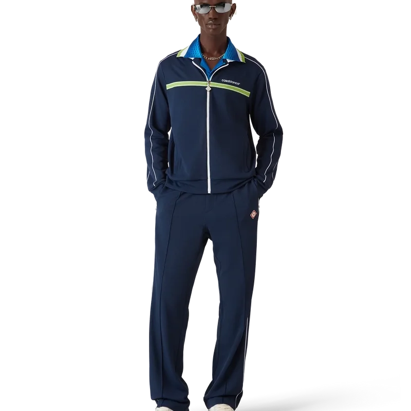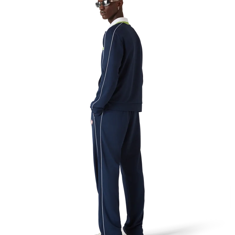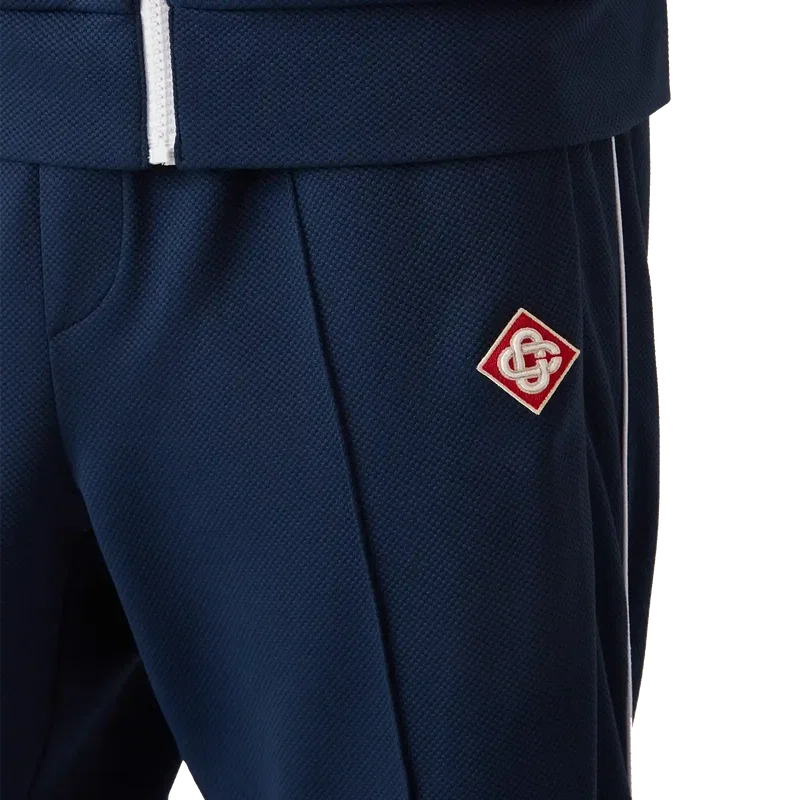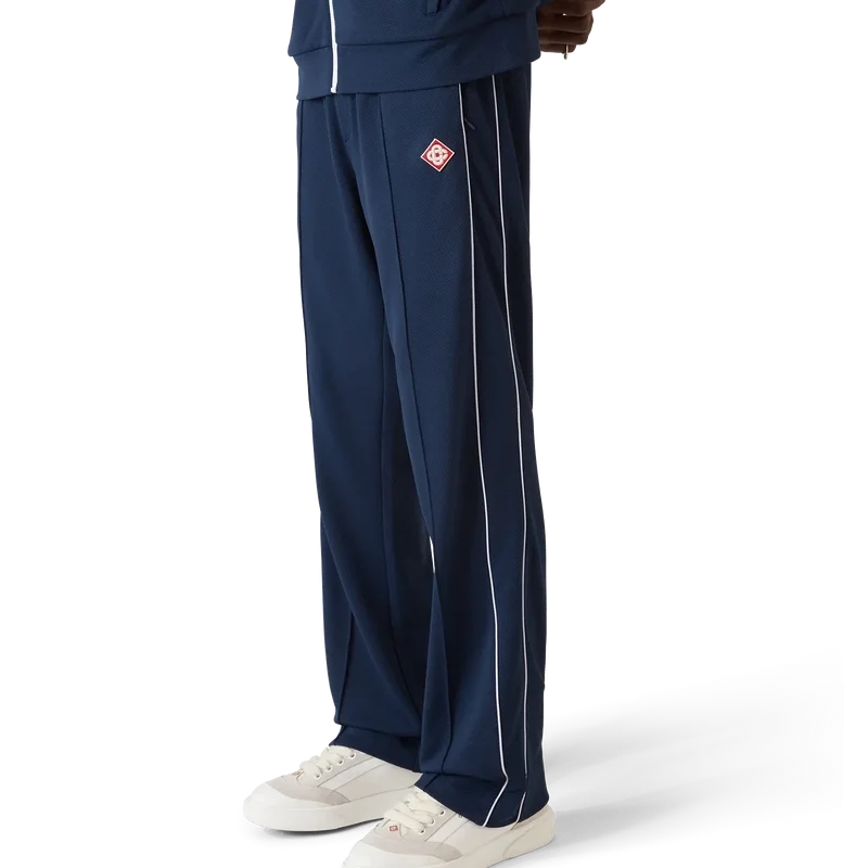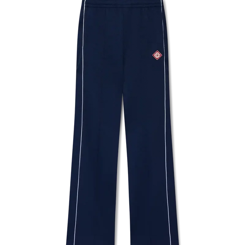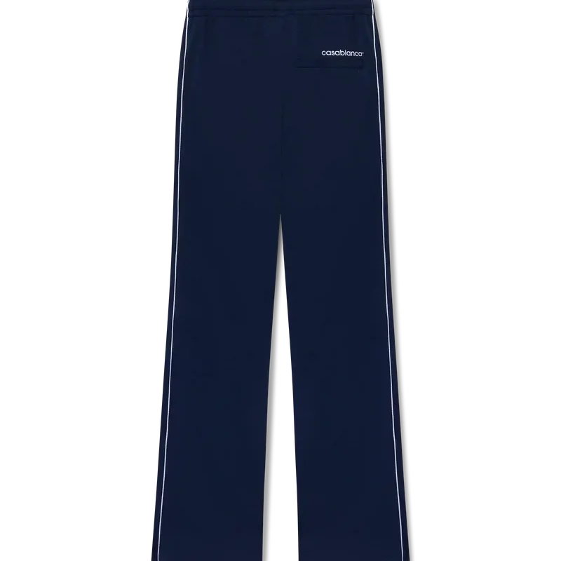I pantaloni da tuta in piqué sono un modello sportivo a gamba dritta che presenta il caratteristico logo a rombo della Maison. Sono rifiniti con una cintura elasticizzata, chiusura con coulisse, tasche laterali, una tasca posteriore a filetto con chiusura a zip e logo Casablanca, e dettagli a piping lungo i lati.