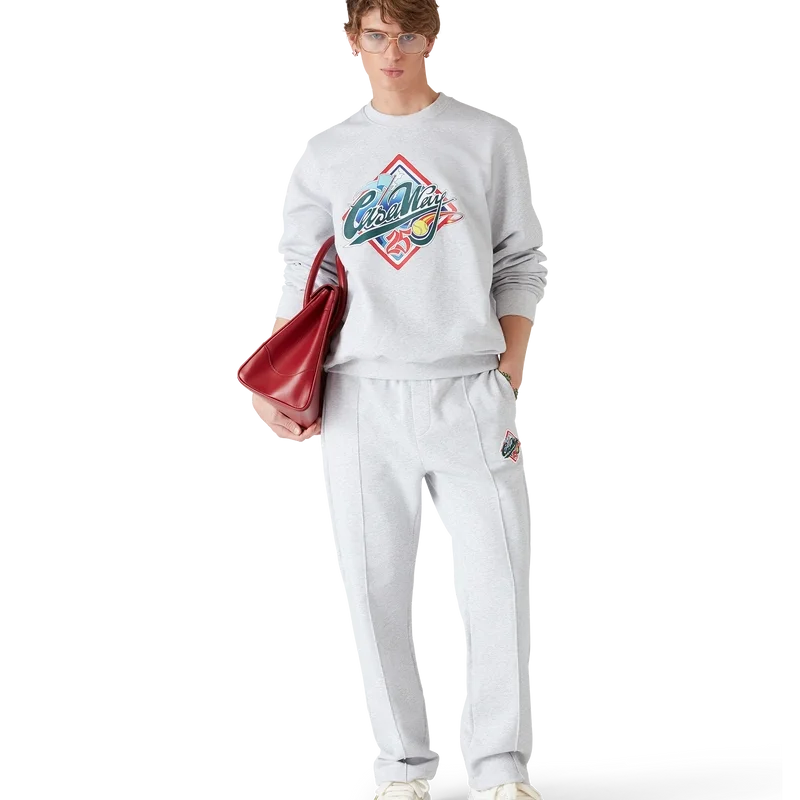 I pantaloni della serie Casa Way World sono un modello classico realizzato in tessuto di cotone biologico con la toppa con la grafica della serie Casa Way World della Maison, che reinterpreta il classico simbolo del baseball americano per il tennis Casa Way. Completati da una cintura elasticizzata, cordino con terminali dorati e fermacorda con logo CC, tasche laterali a filetto, tasca posteriore applicata e cuciture a pieghe sul davanti.
