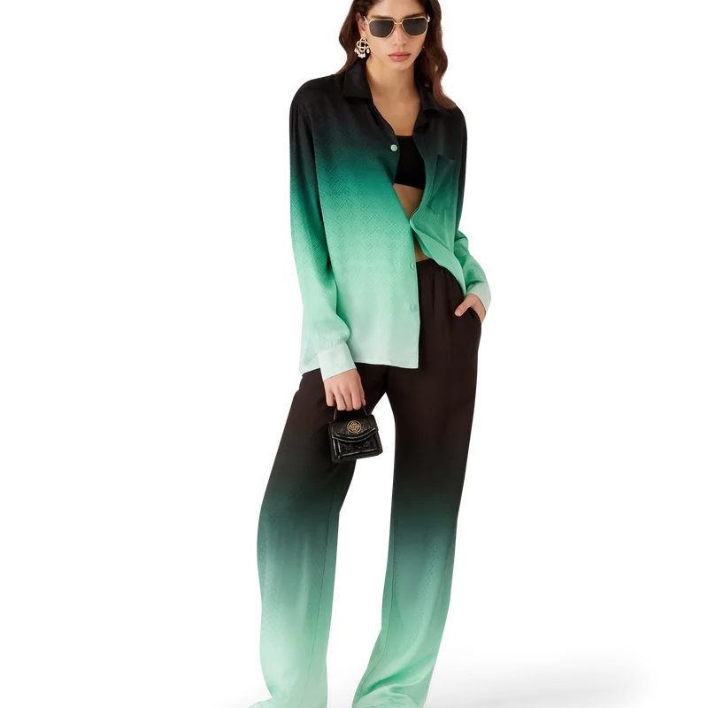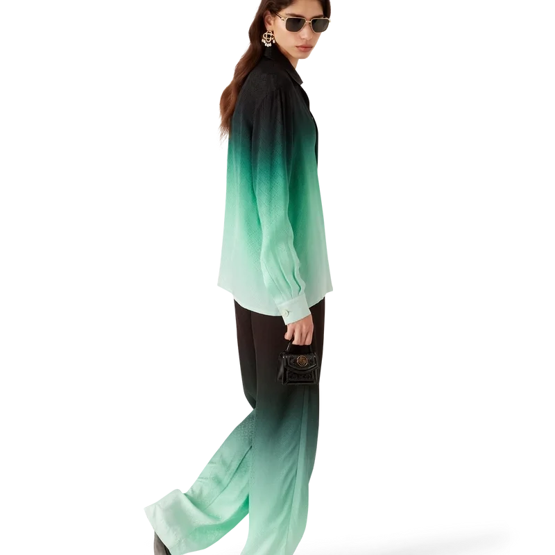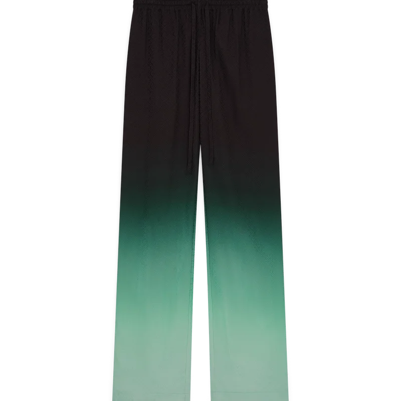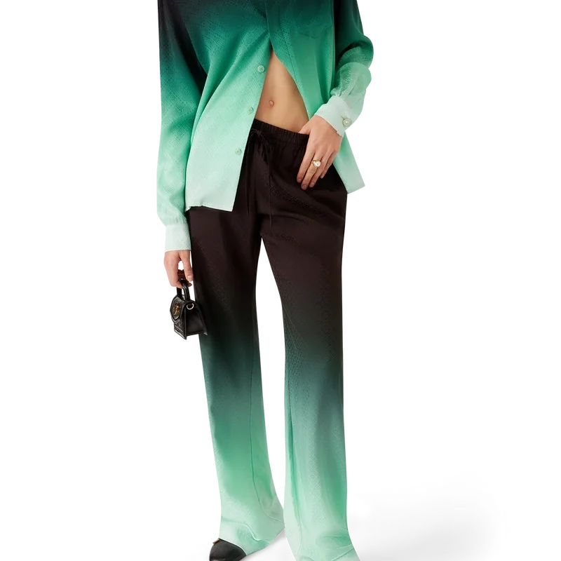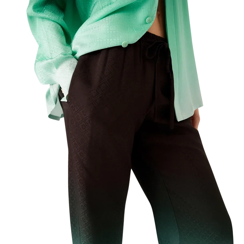 I pantaloni in jacquard “Ping Pong” con effetto sfumato presentano una stampa su tutta la superficie, caratterizzata da un classico monogramma ideato per la nostra prima collezione giapponese, con palline da ping pong in movimento che scorrono in diagonale come motivo ripetuto. Realizzati in twill di seta sfumato, sono rifiniti con elastico in vita, tasche interne, una tasca applicata sul retro e chiusura con coulisse.