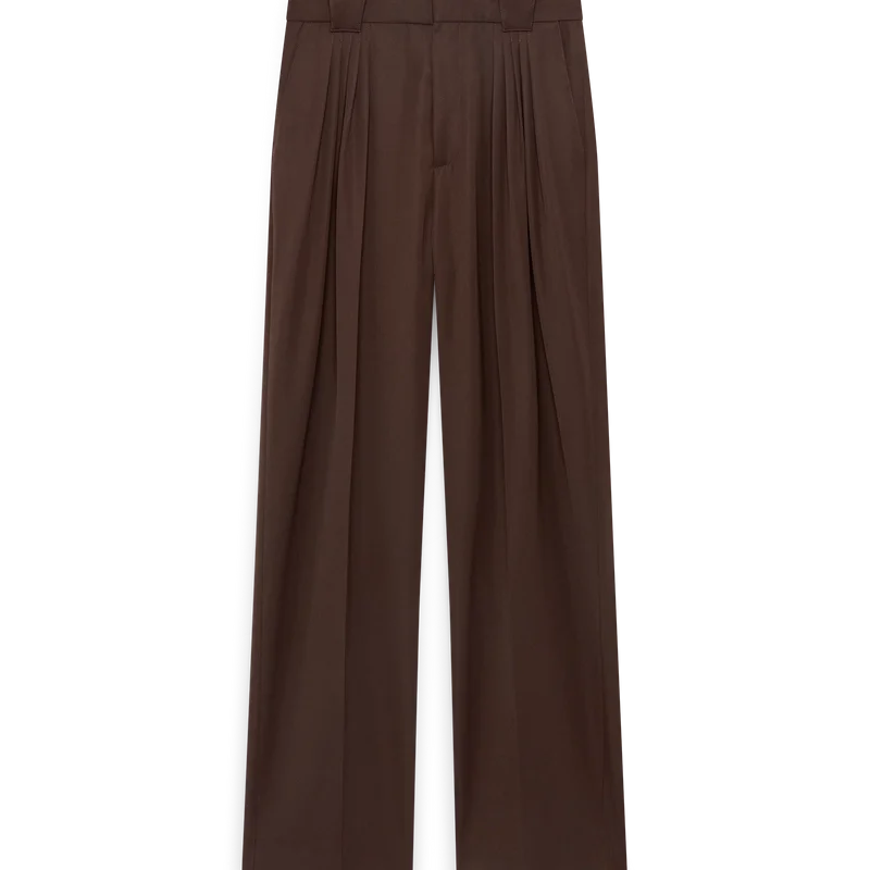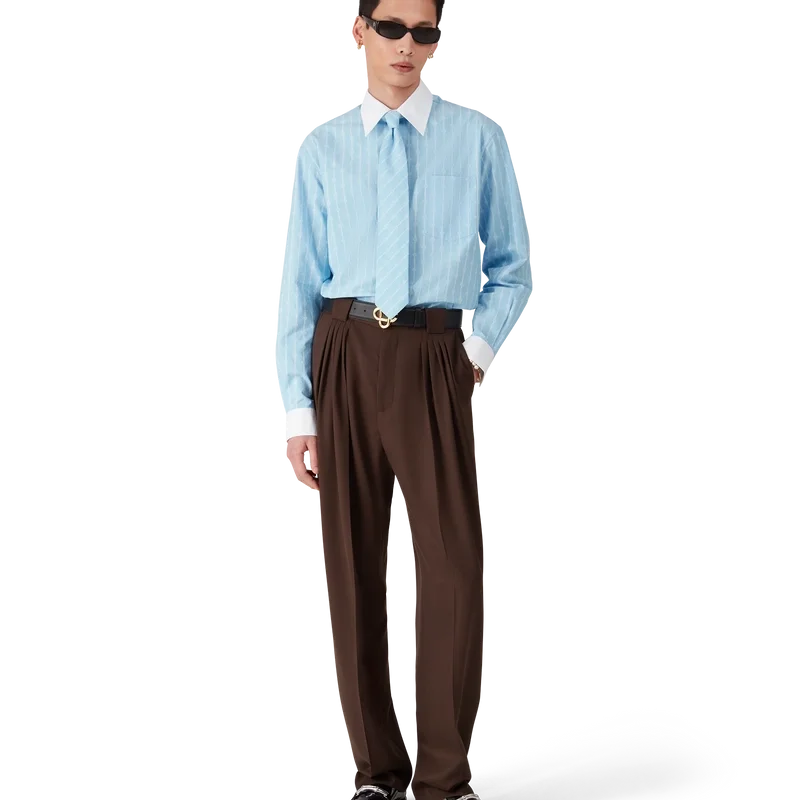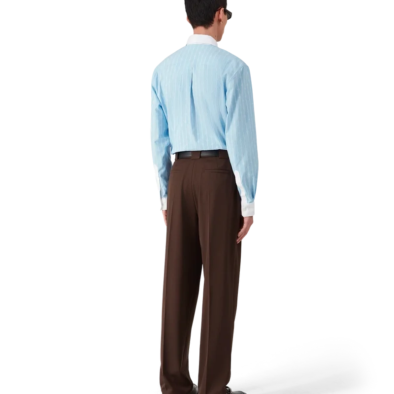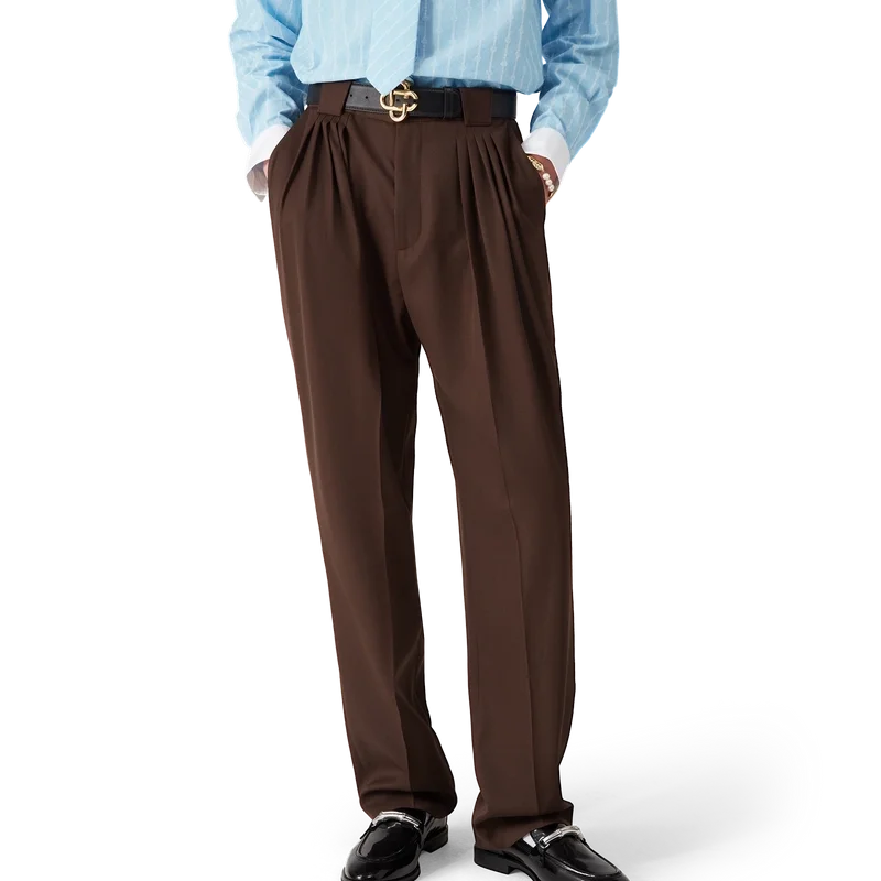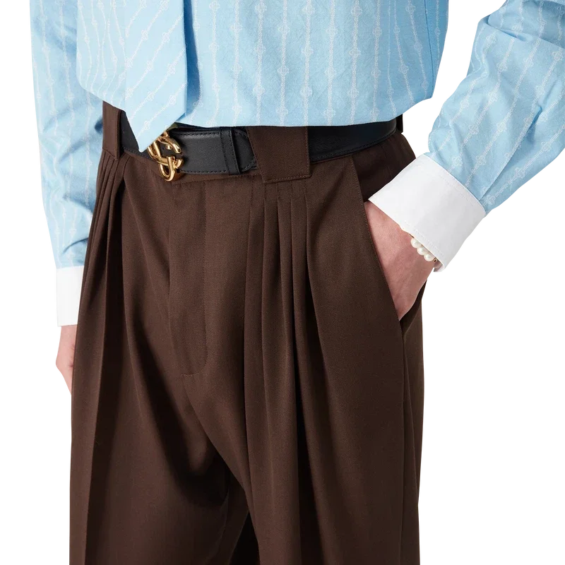 I pantaloni in lana a cinque pieghe presentano un design affusolato, sono realizzati in lana vergine e hanno una fodera in misto cotone. Sono dotati di chiusura con cerniera, cinque pieghe sul davanti, tasche anteriori oblique, tasche posteriori a filetto con una piccola piega a scatola e passanti per cintura larghi.