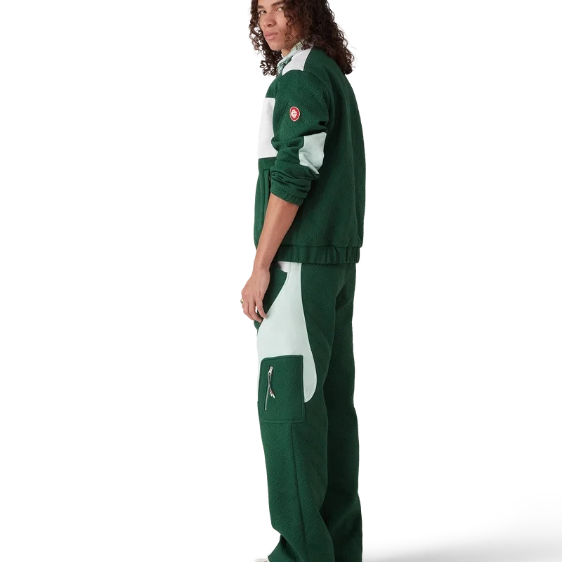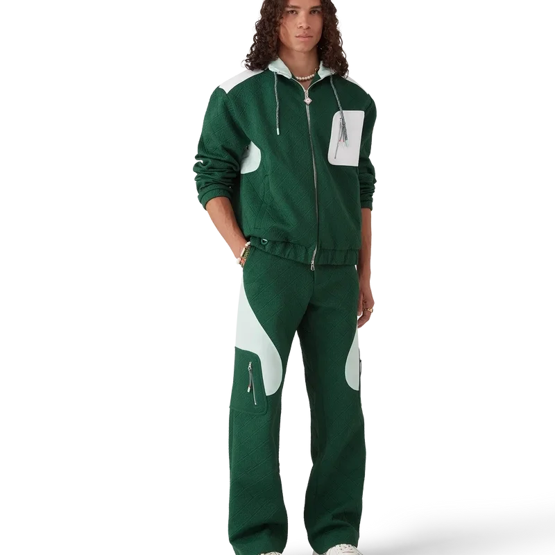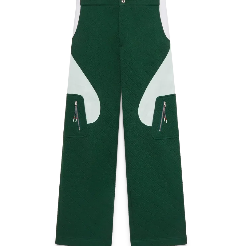 I pantaloni in maglia jacquard Monogram presentano un design a gamba dritta con pannelli a blocchi di colore a contrasto. Sono rifiniti con una cintura dotata di bottone a pressione placcato oro con marchio, chiusura con cerniera, pannelli laterali a contrasto, tasche anteriori oblique e tasche applicate laterali con chiusura a cerniera verticale e tiranti ispirati alle corde da alpinismo.