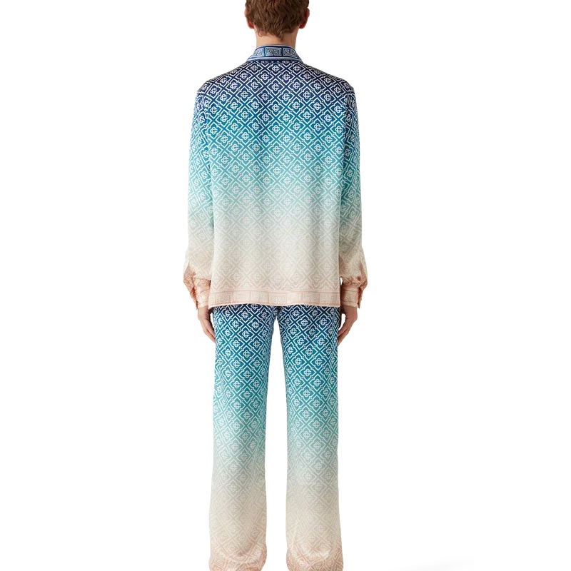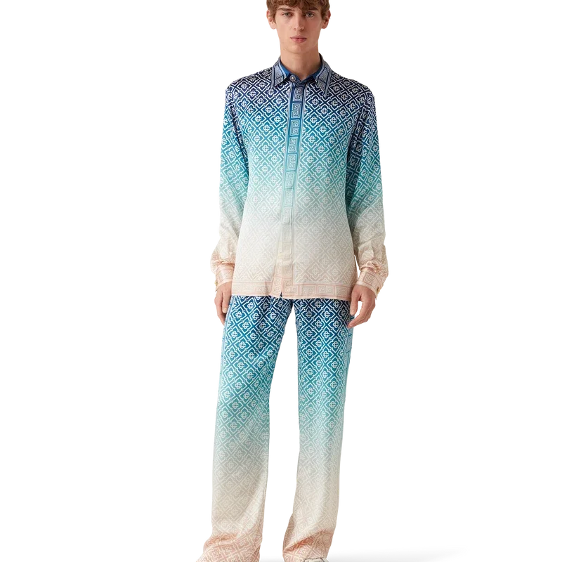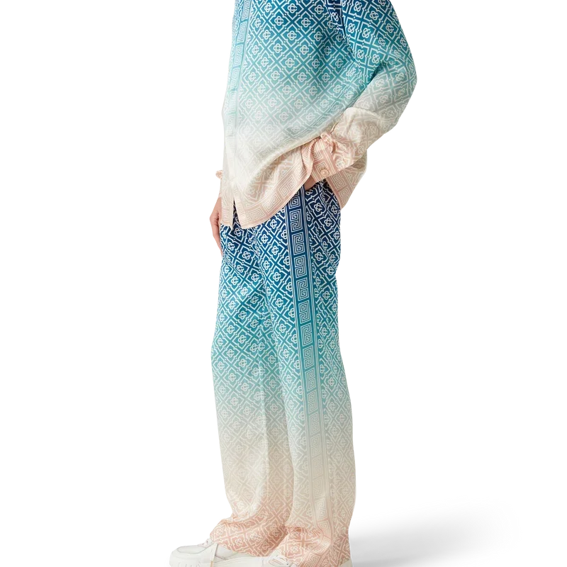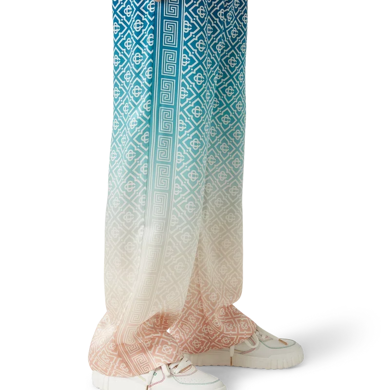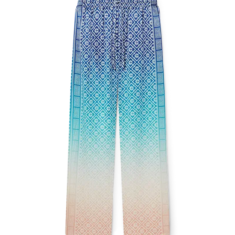 I pantaloni in seta jacquard sfumato presentano una stampa all-over con il monogramma iconico della Maison, realizzati in tessuto di raso di seta. Rifiniti con elastico in vita, tasche interne e fodera.