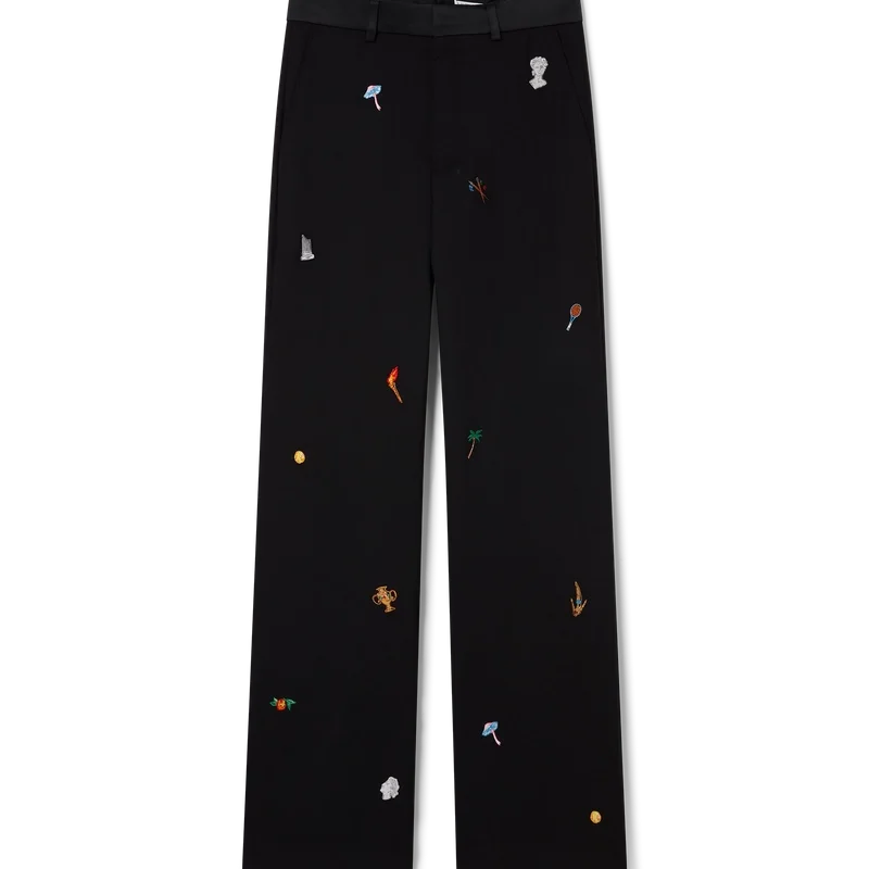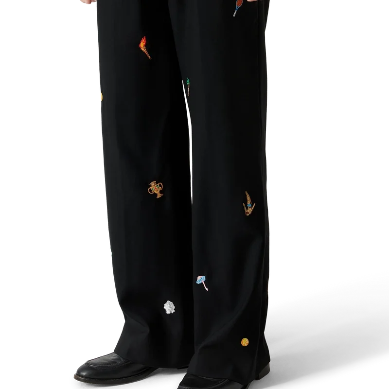 I pantaloni sartoriali in lana con motivo ricamato presentano una silhouette classica e sono realizzati in tessuto di lana ricamato. Rifiniti con un ricamo che rappresenta la simbologia della Maison legata alla natura e all’architettura, tasche laterali oblique, fodera, chiusura con zip, passanti per cintura e tasche posteriori. Da indossare con la giacca coordinata.
