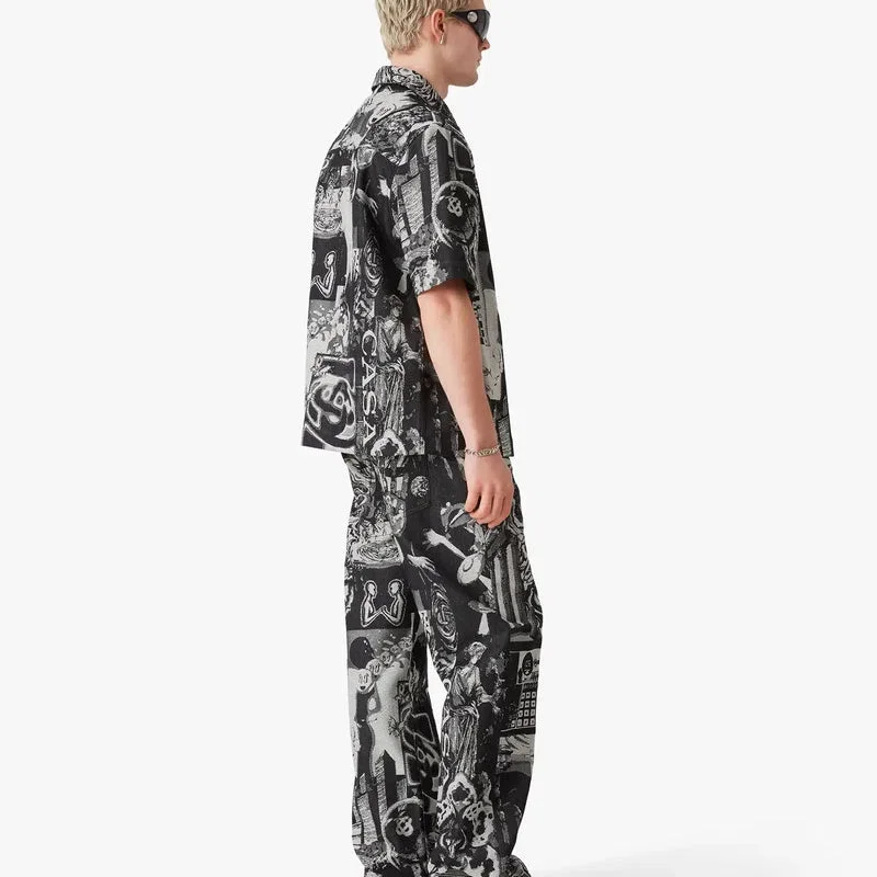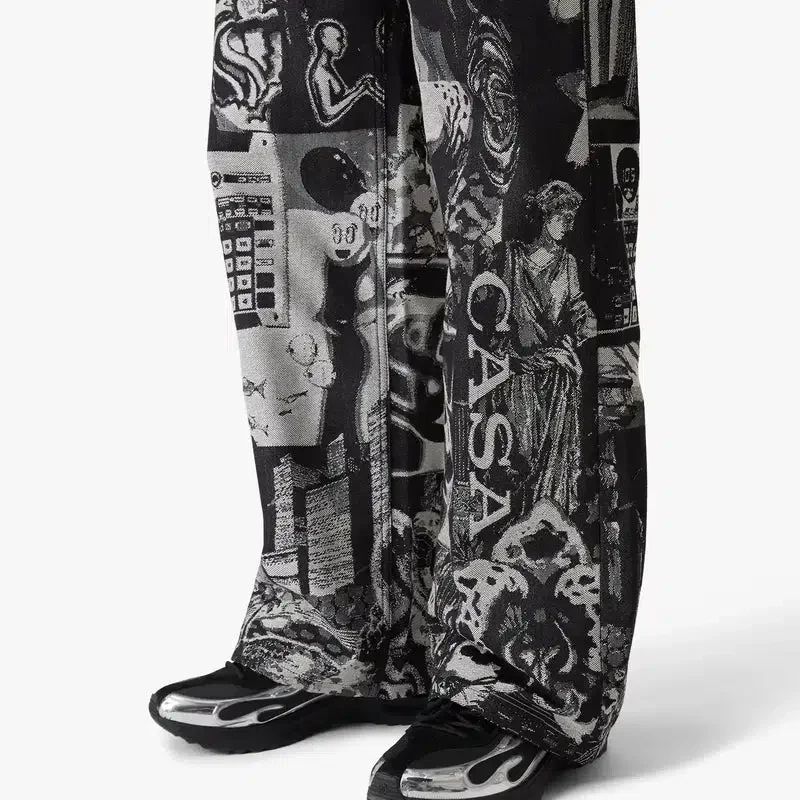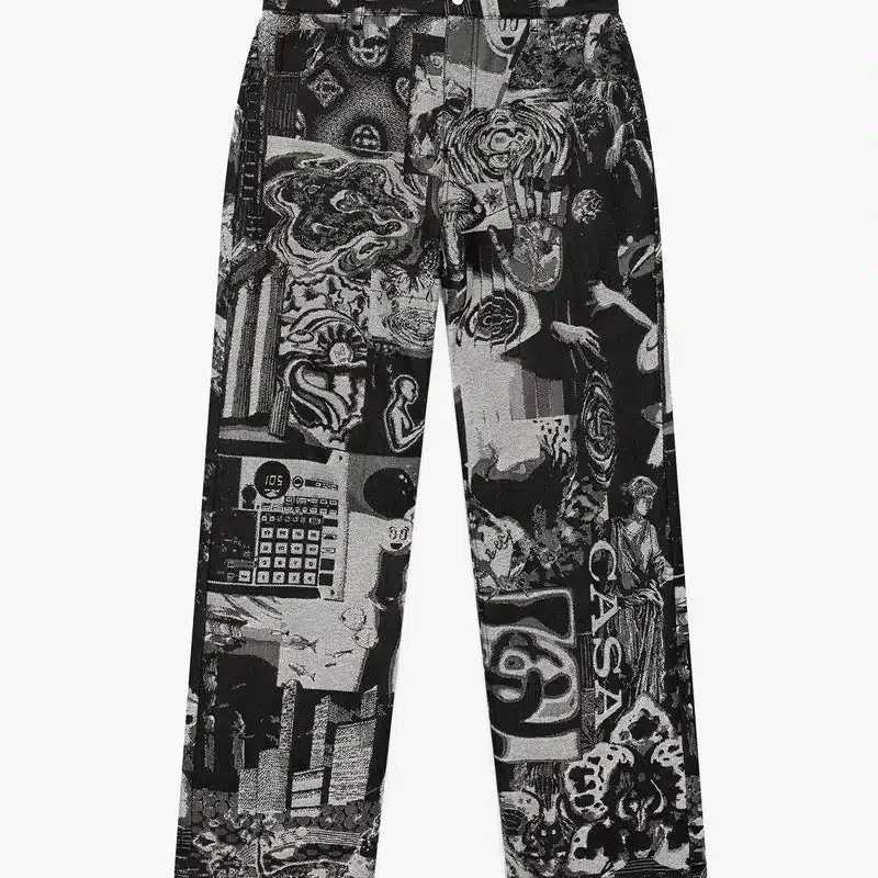 I jeans a gamba dritta Rave Collage presentano un design raffinato, caratterizzato da una grafica stagionale che reinterpreta una collezione disordinata di volantini rave e iconografia, trasposta in una trama sgranata attraverso una trama in denim jacquard. Completati da passanti per cintura, chiusura con zip, tasche anteriori e posteriori, fodera e dettagli metallici placcati argento.
